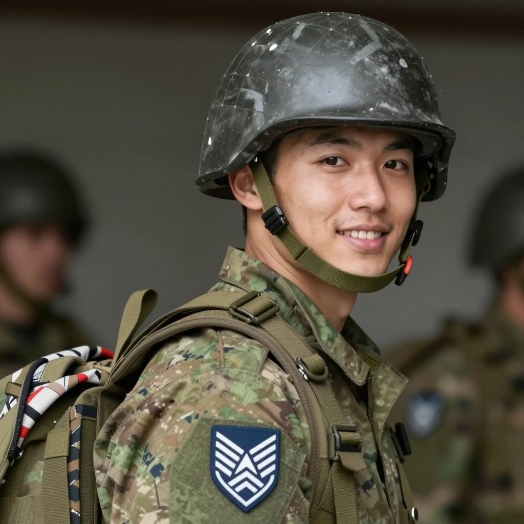 Male soldier with light skin, short dark hair, wearing a metal mesh helmet and olive green uniform, smiling. He carries a backpack with a white, black, and red pattern on his back. Dark indoor background with blurred objects. Soldier has a blue and white insignia on his left shoulder.