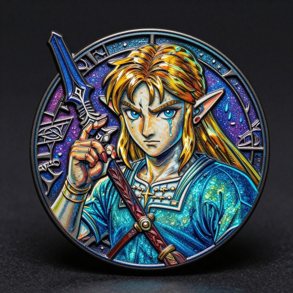 Digital art of Link from Zelda, with glowing blue eyes, holding a sword, wearing a blue tunic, in a circular, neon-styled frame