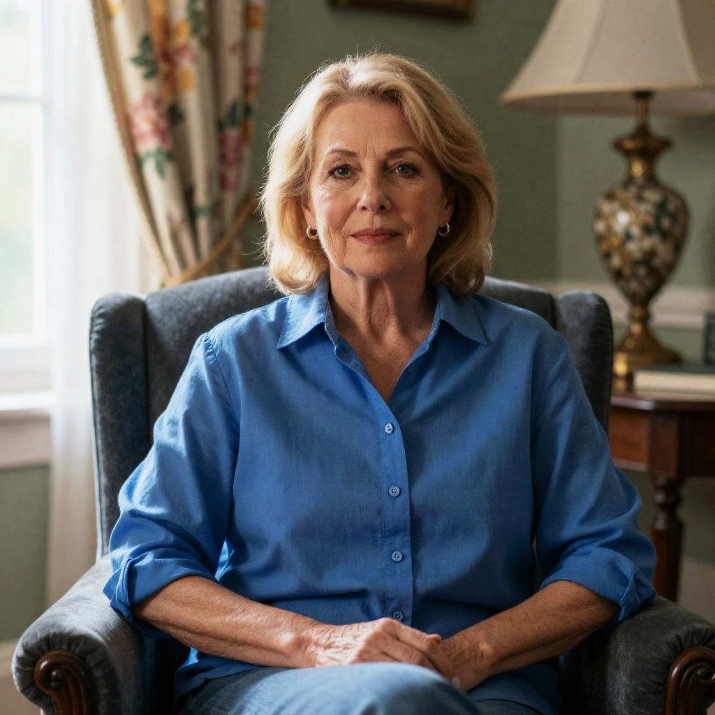Portrait of a smiling middle-aged Caucasian woman with blonde hair wearing a dark navy sweater, seated on a wooden chair outdoors. She is raising her right hand in a friendly wave. The background features green leafy trees with sunlight filtering through the leaves, suggesting a peaceful, natural setting.