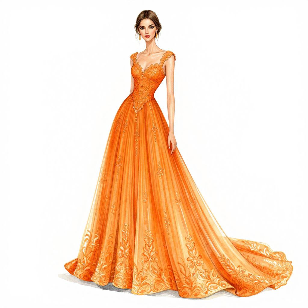 Elegant watercolor fashion illustration showcasing a woman in a vibrant orange gown with intricate lace detailing, flowing pleats, and a dramatic train, created by SilverRidgeStudio.