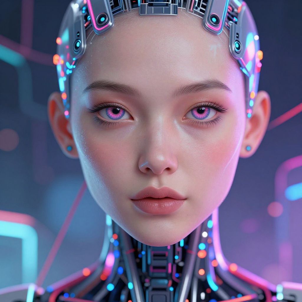 A hyper-realistic CGI image of a young, fair-skinned woman with a futuristic, cybernetic appearance. Her smooth, porcelain-like skin is illuminated by colorful, neon lights that accentuate her symmetrical face and large, pinkish-purple eyes. She has a hairless, robotic head with intricate, glowing circuitry on top. Her lips are slightly parted, showing a neutral expression. She wears a high-tech, metallic collar with more neon lights around her neck. The background is a blurred, dark blue and purple gradient with geometric shapes, enhancing the sci-fi aesthetic. The image emphasizes a blend of human and machine elements.