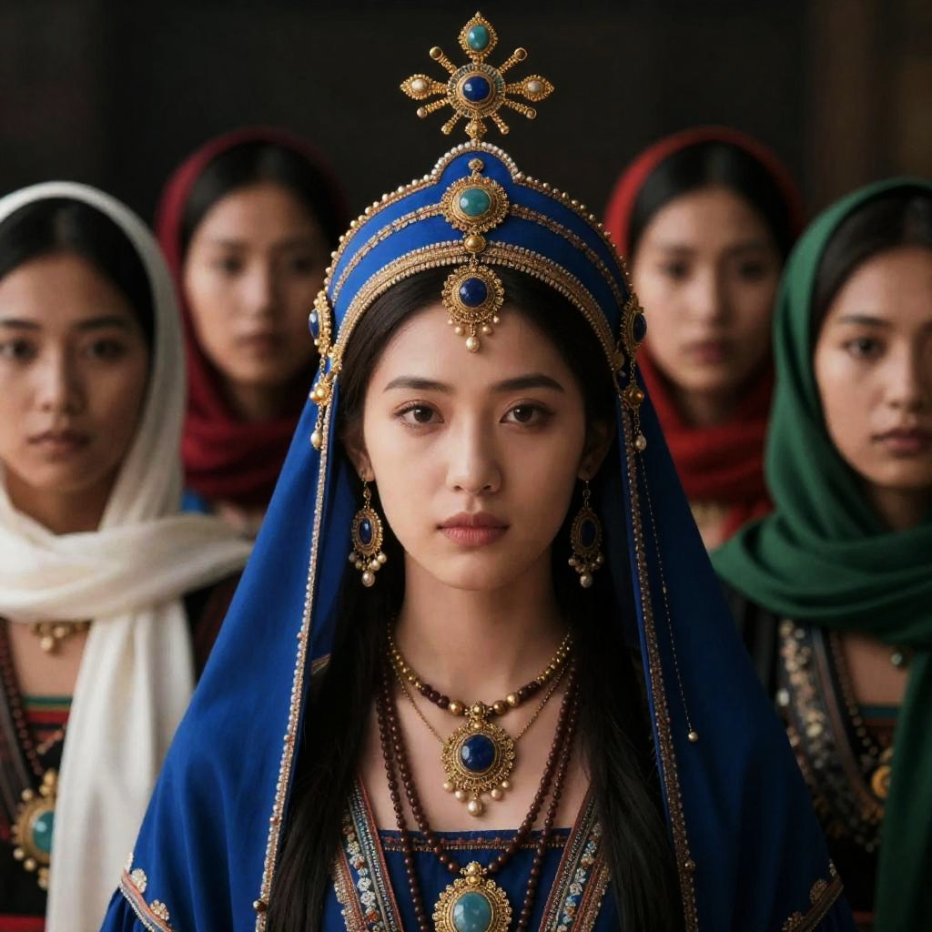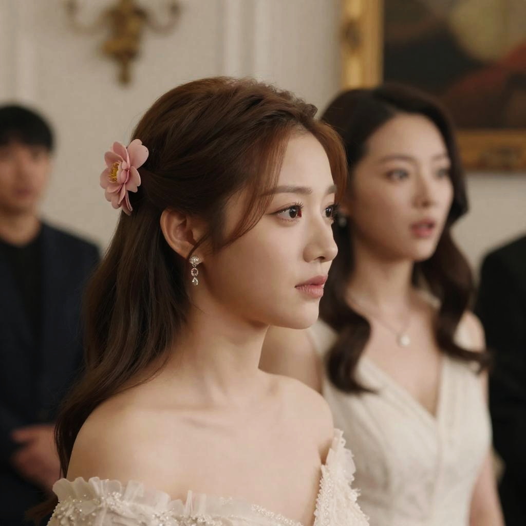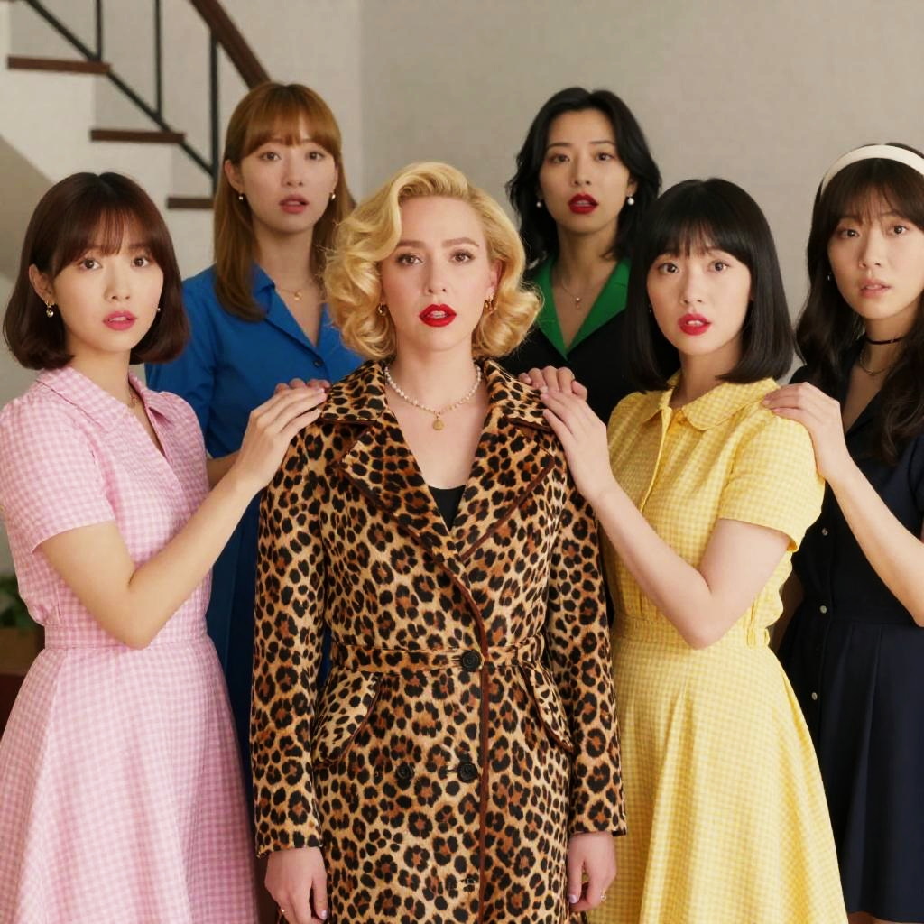 Photograph of six women in vintage dresses, standing close together. Center woman with blonde hair in floral headband, gold embellished dress. Women on left and right in pink, white, and floral dresses. Soft lighting, slightly blurred background. Women have neutral, slightly intense expressions.