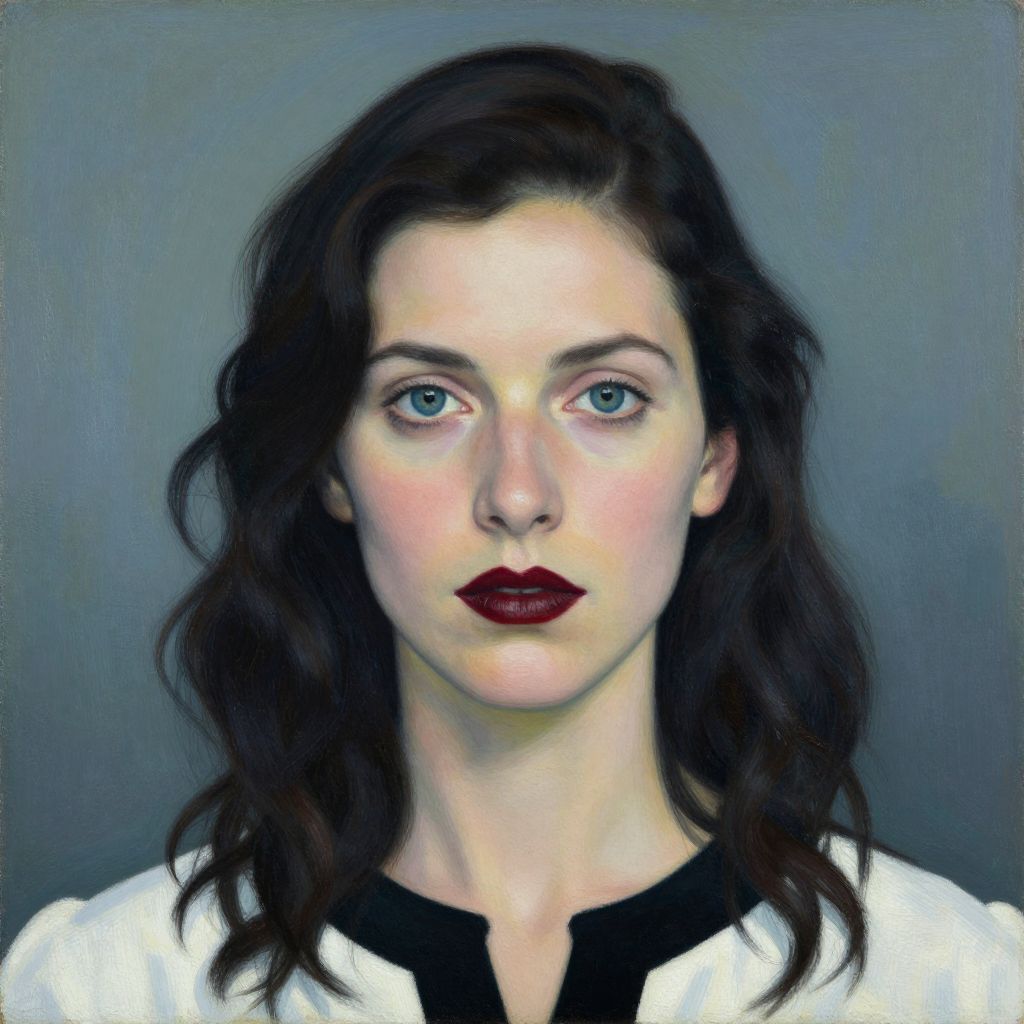 The image is a striking portrait by Marlene Dumas, featuring a woman with dark, wavy hair that cascades down her shoulders. Her eyes are a striking shade of blue, gazing directly into the viewer, creating a sense of connection and intensity. The woman's lips are painted a deep, bold red, contrasting sharply with her fair skin. She is wearing a white garment with a black collar, which adds a touch of elegance and sophistication to her appearance. The background is a blend of muted blues and greens, providing a calm and serene backdrop that allows the subject to stand out prominently. The overall composition is balanced, with the woman's face centered and the colors harmoniously arranged, creating a visually captivating and emotionally resonant piece of art.