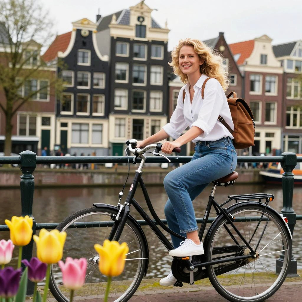 Photograph of a smiling blonde woman with wavy hair, wearing a white blouse, blue jeans, and white sneakers, sitting on a black bicycle with a brown backpack. She is positioned on a bridge over a canal in an urban setting. In the background, there are traditional Dutch buildings with black, white, and red facades. Foreground features blurred pink and yellow tulips. The woman's casual attire and relaxed posture contrast with the formal architecture. The image has a vibrant, colorful style, capturing a cheerful moment in a picturesque European cityscape.