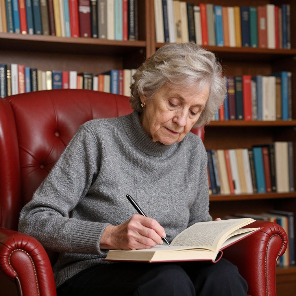 Elderly woman with short gray hair, wearing a gray sweater, writing in an open book while seated in a red leather chair in a library with