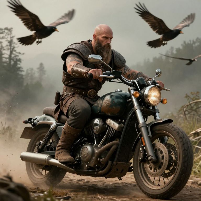 In this high-fantasy illustration, a bald Viking warrior, adorned with intricate tattoos and a long beard, confidently rides a rugged motorcycle through a misty, forested landscape. The motorcycle, with its exposed engine and weathered appearance, is bathed in a warm, cinematic lighting that enhances its photorealistic details. The warrior's armor, featuring elaborate designs and symbols, complements the motorcycle's robust, mechanical aesthetic. Birds, seemingly in flight, add a sense of motion and freedom to the scene. The overall composition, with its dynamic interplay of textures, colors, and spatial relationships, evokes a sense of adventure and mythic storytelling, reminiscent of the style by Greg Rutkowski.