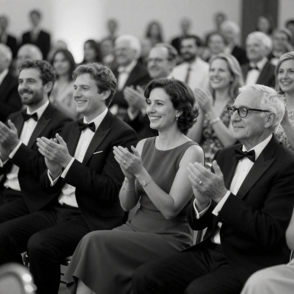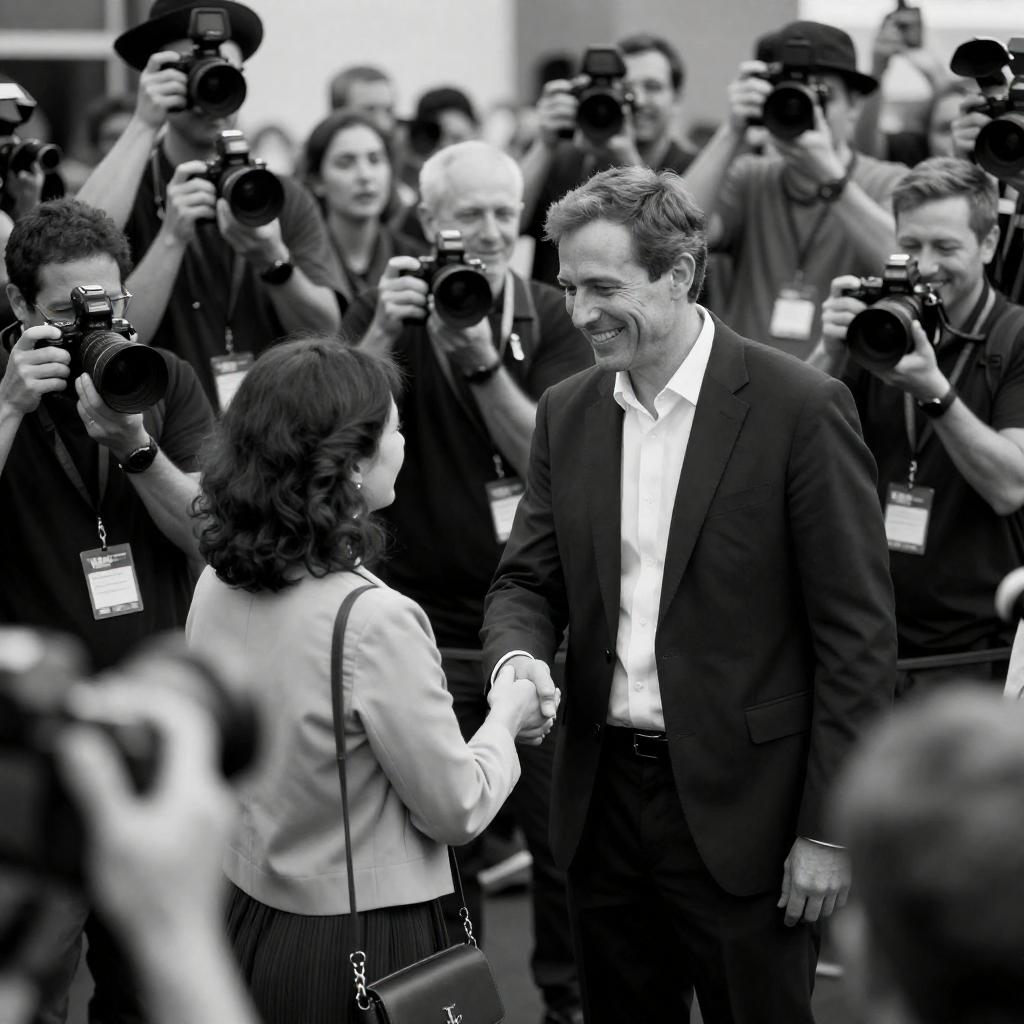Black-and-white photograph of a crowded press event. A man in a dark suit and white shirt, smiling, shakes hands with a woman in a light jacket and dark skirt. Surrounding him, numerous photographers with cameras, some holding hats, capturing the moment. The crowd is dense, with varied expressions of excitement and focus.