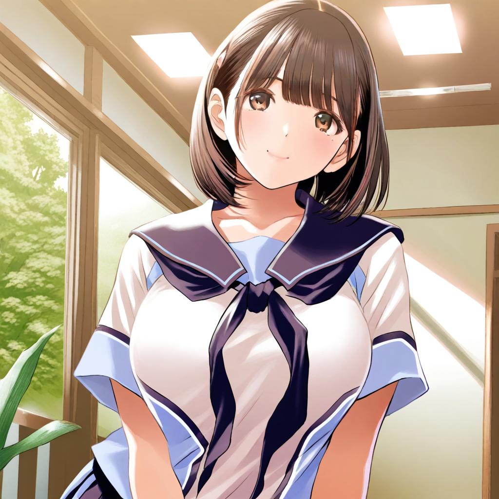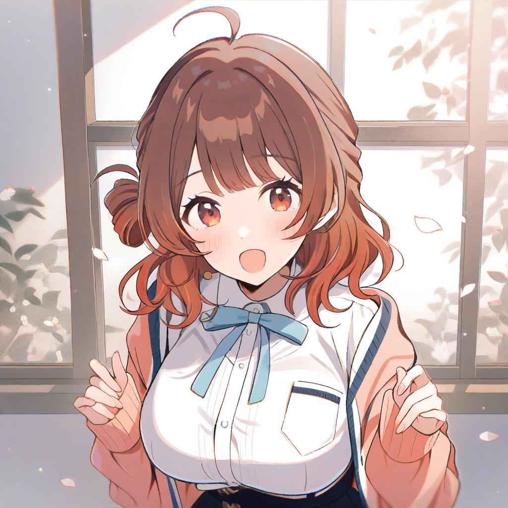 Hanami ume, gakuen idolmaster, 1girl, brown eyes, brown hair, gradient hair, medium hair, ahoge, single side bun, large breasts, school uniform, white shirt, by artist mozukuzu (manukedori), animagine
