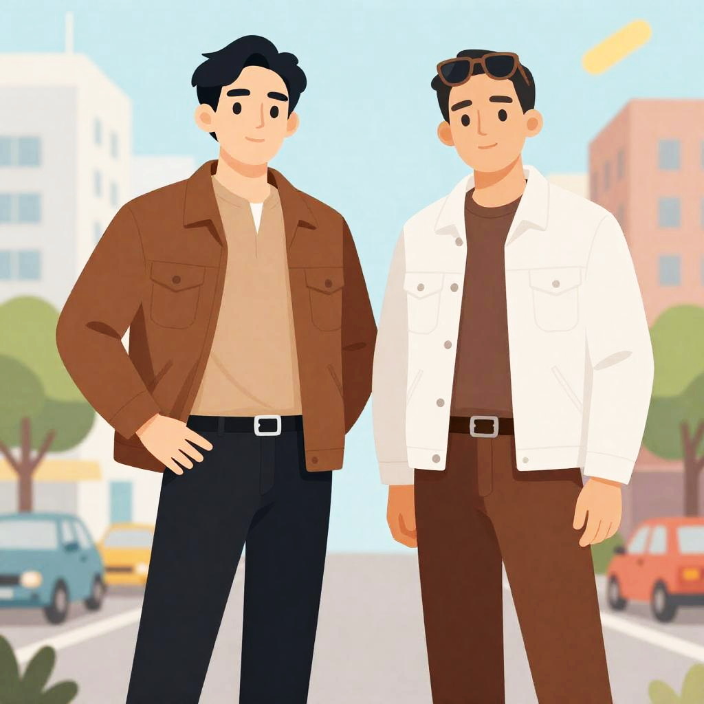 Illustration of two men standing side by side. One wears a brown jacket, tan shirt, and black pants, hands on hips. The other wears a white jacket, brown shirt, and brown pants, sunglasses on head. Background: colorful cityscape with buildings, trees, cars, and flying objects. Both men have neutral expressions.