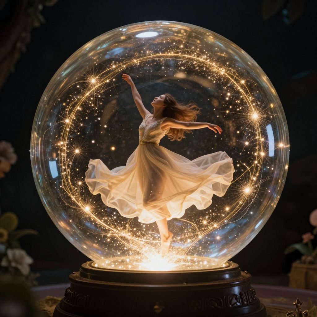 A luminous glass orb encases a woman in a flowing dress, suspended in a magical dance amidst swirling golden sparks, defying gravity and time in a surreal, enchanted world.