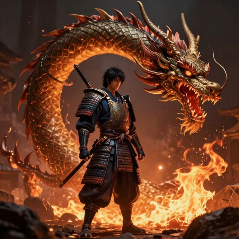Art by johnson ting!!!, a samurai standing near a fire breathing dragon, atmospheric lighting, extremely detailed art, sharp focus, trending on deviant art, artstation.