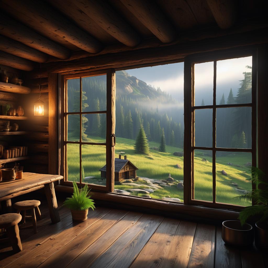 Interior of a cozy wooden log cabin featuring large windows offering a misty view of a pine forest and grassy hills. The room includes wooden floors, potted ferns, a small shelf with books, and warm ambient lighting from a lantern and candles.