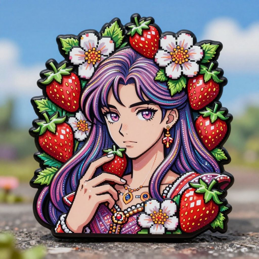 Digital anime-style portrait of a purple-haired woman with pink eyes, surrounded by strawberries and flowers, wearing ornate jewelry, set against a blurred outdoor background