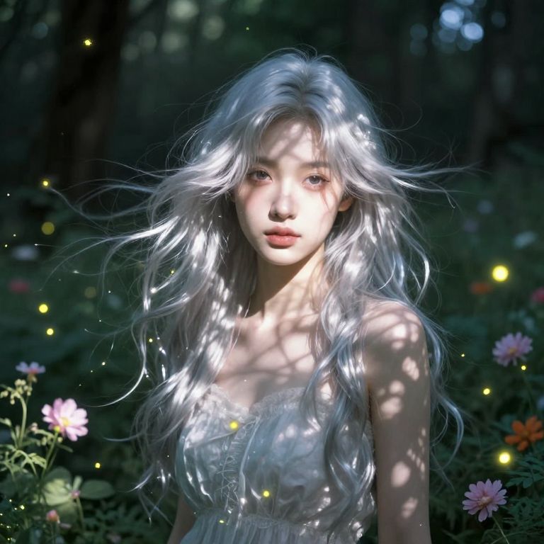 An ethereal portrait in the style of romantic art captures a mystical figure with cascading silver hair, reflecting iridescent colors under moonlight. From an aerial perspective, her translucent wings are visible, gracefully folded against her back as she gazes upwards, evoking both serenity and longing. The soft, diffused light casts shadows that dance across her delicate features, highlighting the subtle emotion in her half-lidded eyes, while a solitary diamond-like dewdrop clings to a petal of a nearby enchanted flower. This dreamlike scene transcends reality, blending fantasy with the sublime beauty of romantic artistry.