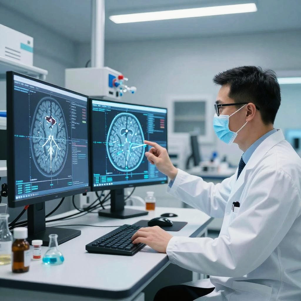 Futuristic medical research scene on Parkinson's disease, scientists analyzing brain scans with advanced holographic displays, clean and modern lab environment, cool color palette with blues and whites, high detail