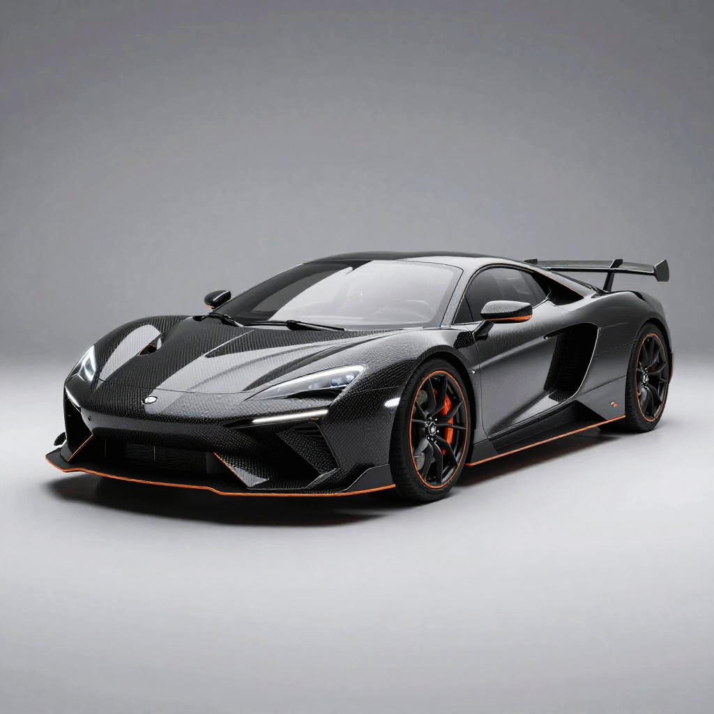 AI car image generator designing a luxury sports car with sharp contours and carbon fiber elements, illuminated by soft studio lighting, emphasizing texture and material quality, minimalistic background highlighting cutting-edge AI technology integration.