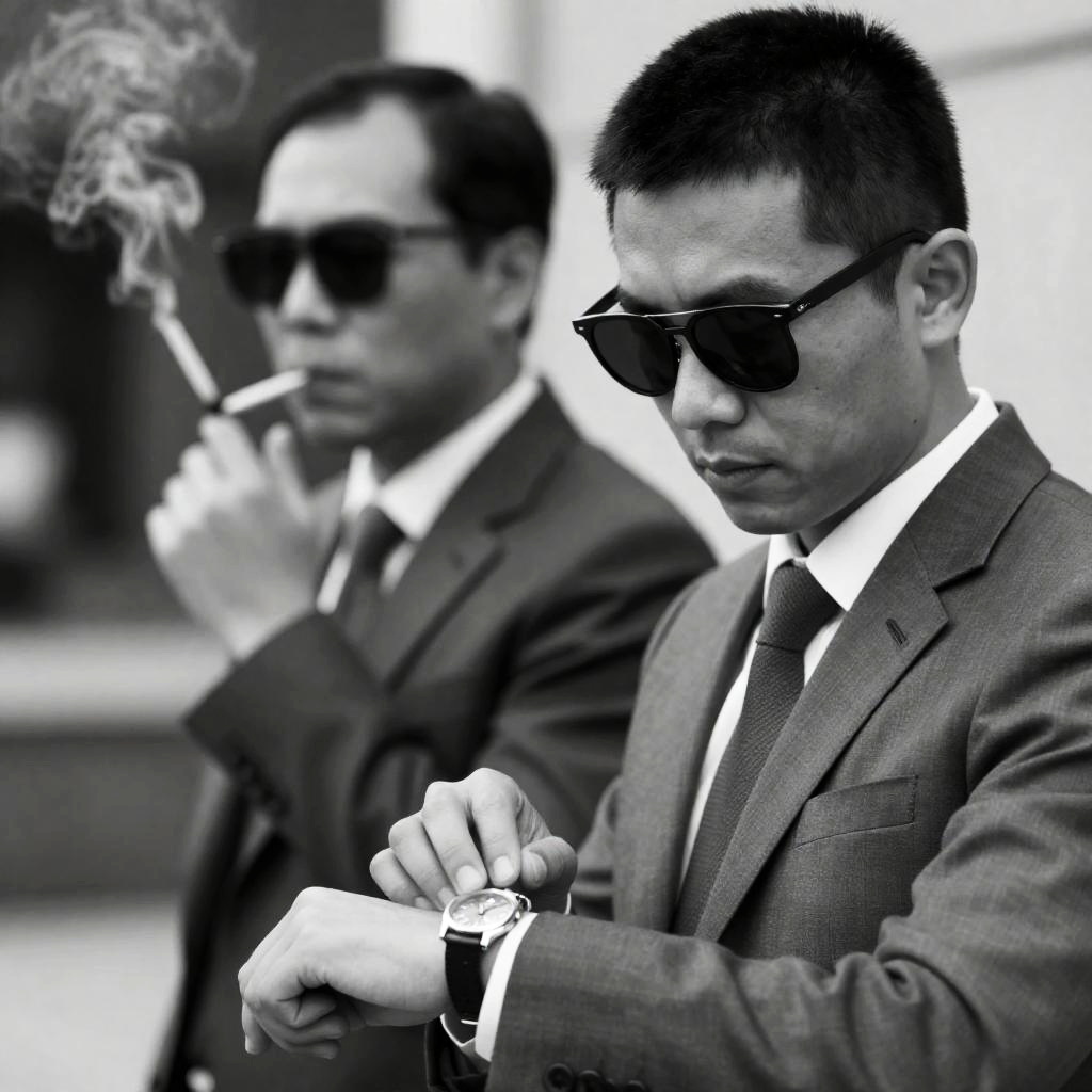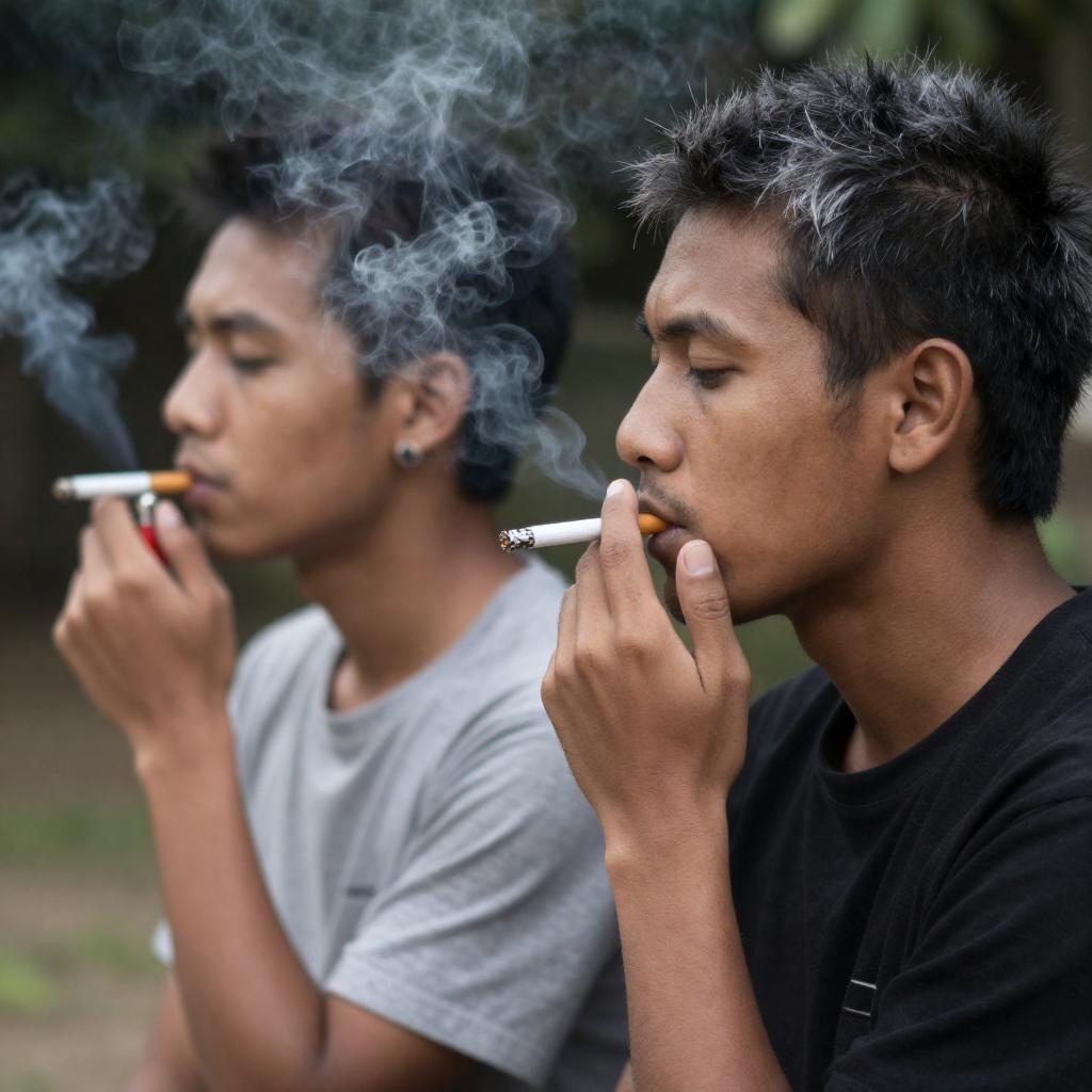 Photograph of two men with spiky hair, smoking cigarettes. Man on right has prominent mohawk, gray shirt, earring. Man on left has shorter spiky hair, dark suit, looking up. White smoke around their faces. Outdoor setting, blurred background. Both men's profiles facing left.
