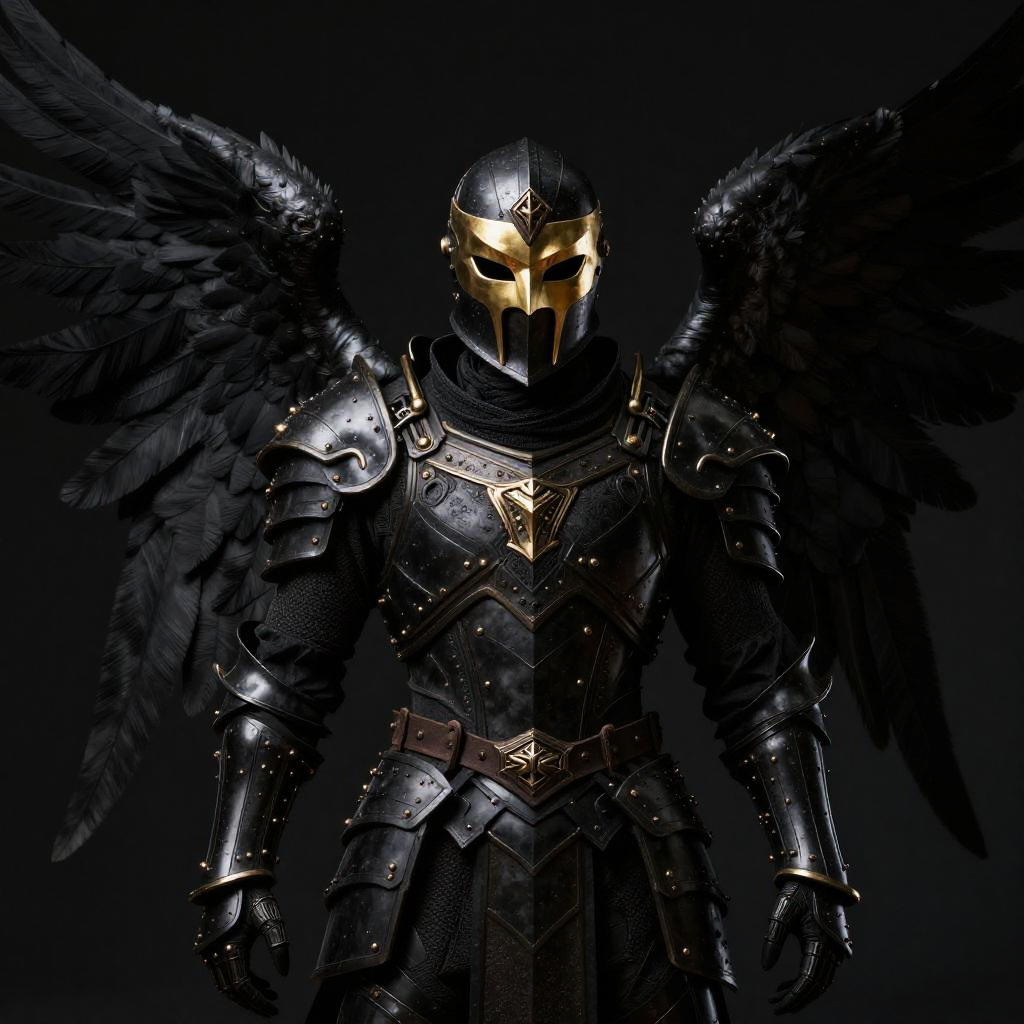Gilded fallen angel with helmet and mask, all-black armor, intimidating face mask and helmet, plain black background, dark black theme, Fujifilm X series, dramatic, complex details, professional photography, 8k, photo-realistic, octane rendering, global illumination, RTX ray tracing, VFX post-processing