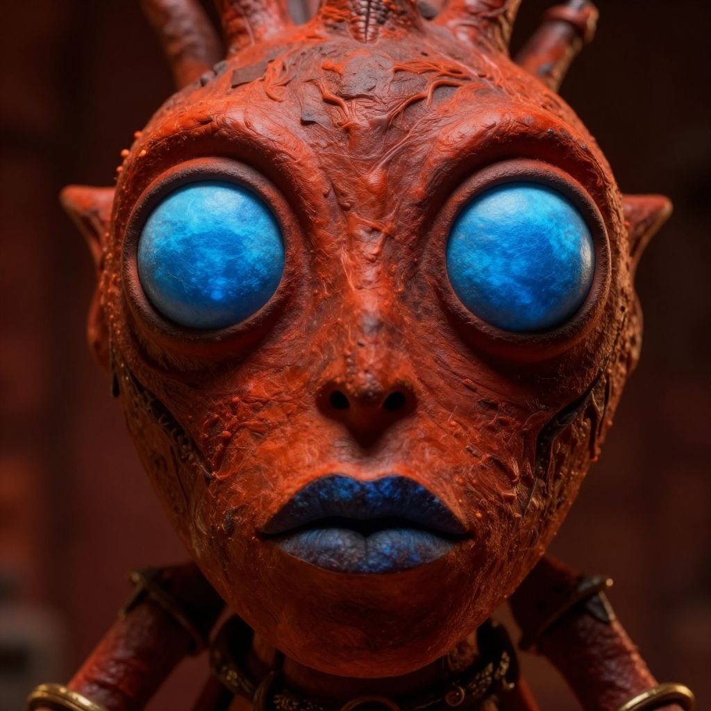 Close-up photograph of a textured, red-orange alien with large, glowing blue eyes, dark blue lips, and antennae-like protrusions on its head