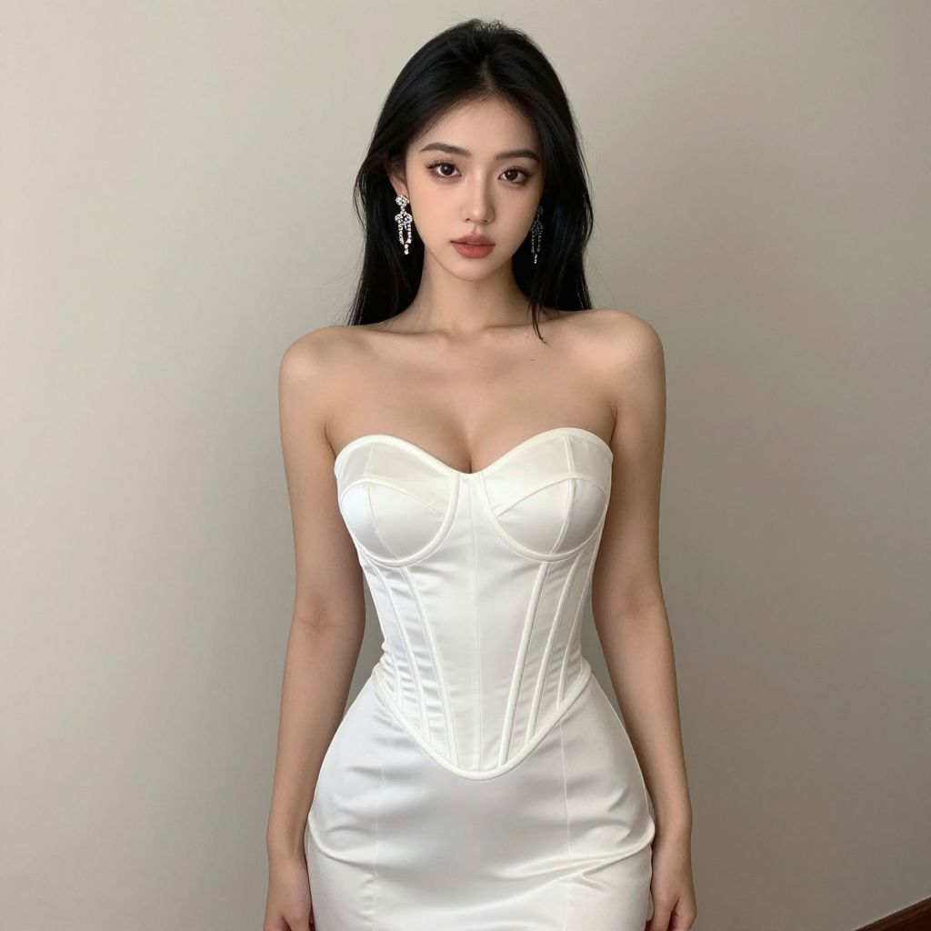 Photograph of an Asian woman with long dark hair, wearing a shiny, yellow satin corset dress, highlighting her ample cleavage, standing against a