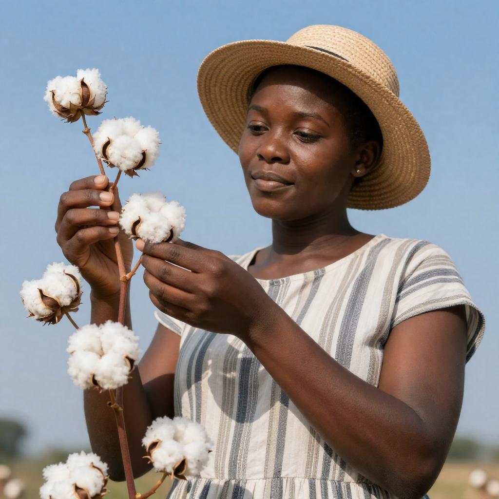 Photograph of three African farmers in a cotton field. Foreground farmer with brown skin, straw hat, beige shirt, looking at camera. Two other farmers in background, also in straw hats, focused on picking cotton. Bright daylight, clear blue sky. Cotton plants with white flowers and green leaves dominate the scene.