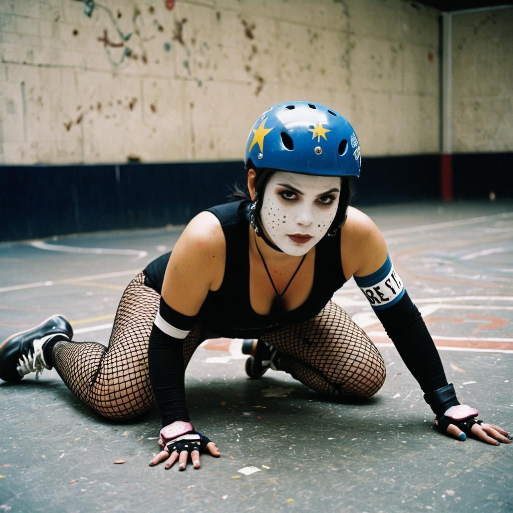 Sassy and trashy photograph of a daring fashionista, vibrant jumpsuit, statement jewelry, bold lipstick, strutting down a busy street during fashion week, cinematic film still, Kodak Portra, chaotic and daring vibe.