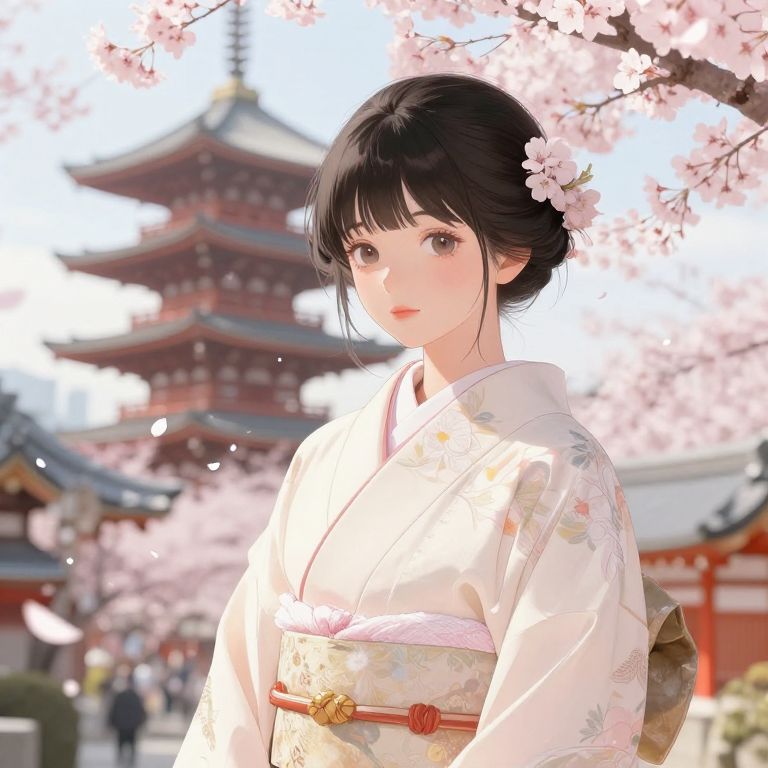 Digital anime-style illustration of a young Japanese woman with fair skin and black hair in a traditional updo, adorned with a cherry blossom. She wears a white kimono with floral patterns and a pink obi, standing in front of a blurred background featuring a traditional Japanese pagoda and cherry blossom trees in full bloom. Soft sunlight filters through the blossoms, casting a gentle glow on her face. The scene exudes a serene, cultural ambiance.