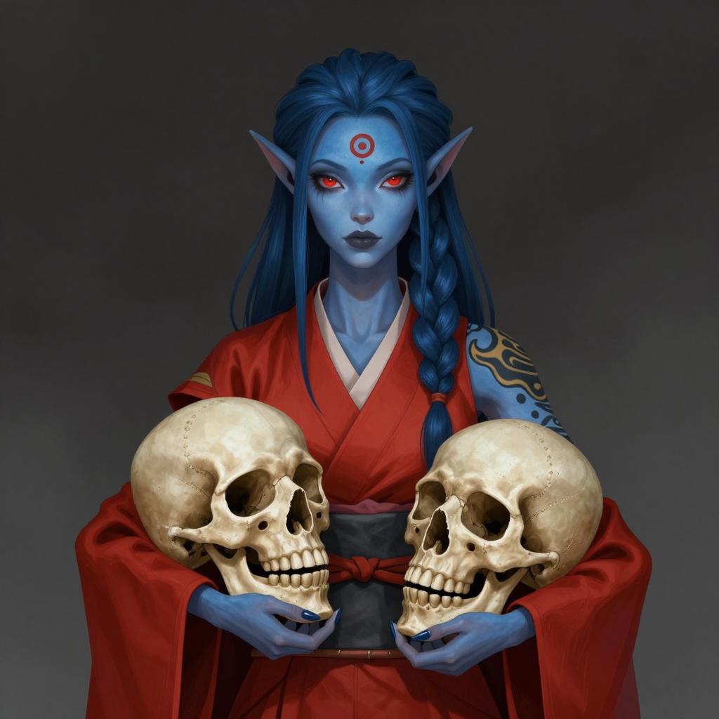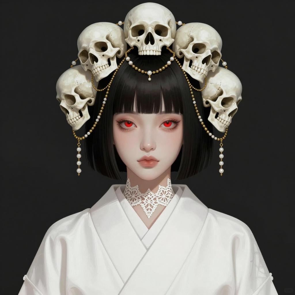 Digital illustration of an Asian woman with pale skin and red eyes, wearing a white kimono. She has a short black bob haircut with straight bangs. Her head is adorned with multiple white skulls, each decorated with gold chains and beads. Her neck has intricate lace patterns. The background is dark. Her facial expression is calm.