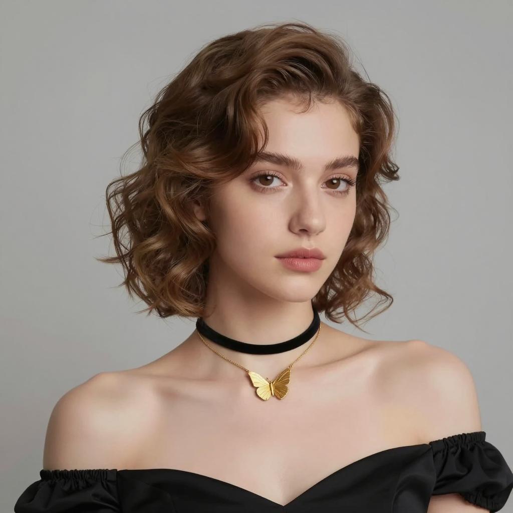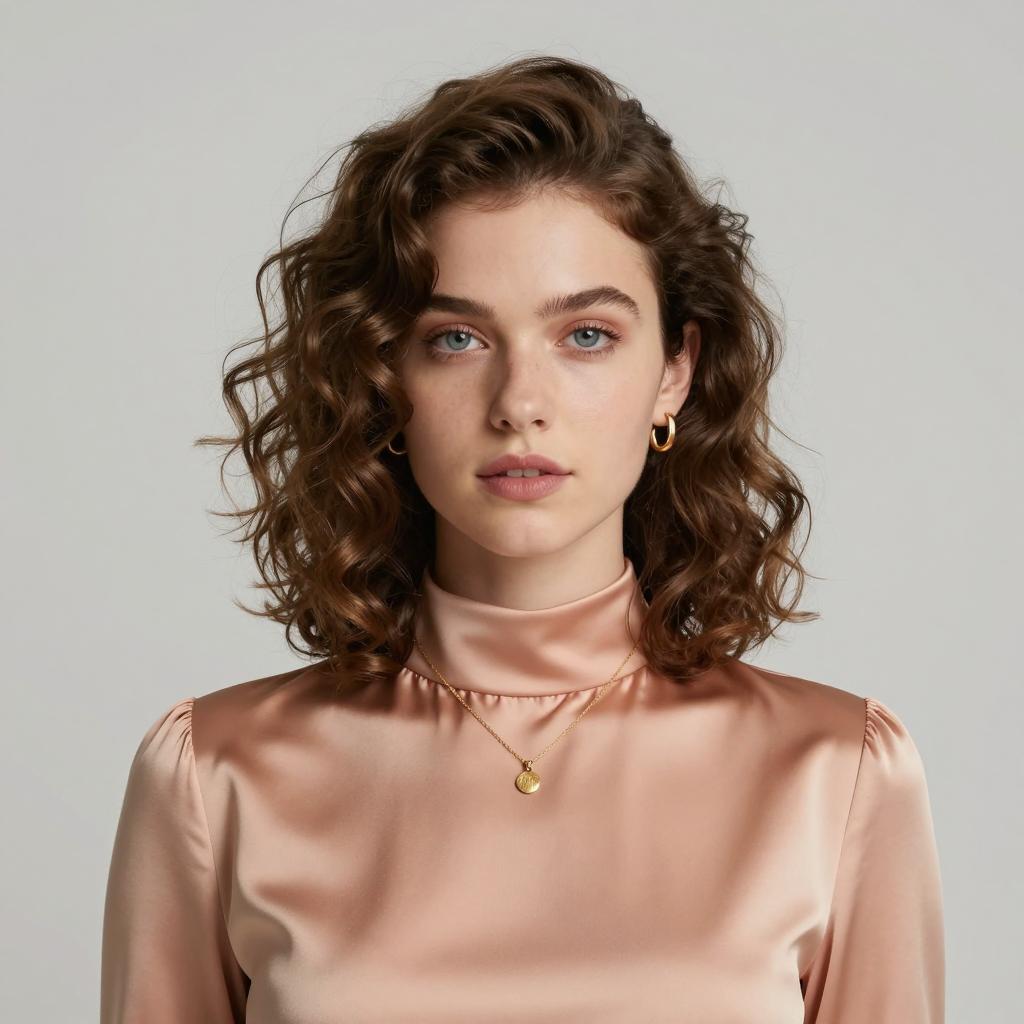 Permanent toupee hairstyle, photo-realistic portrait of a young woman, medium close-up, centered, light gray background, brown hair styled in an elegant updo with side bang, light skin, blue eyes, red lipstick, wearing gold jewelry: earrings, necklace with a central gem, orange dress with puffed sleeves, soft lighting, subtle makeup, sophisticated, classic, elegant style