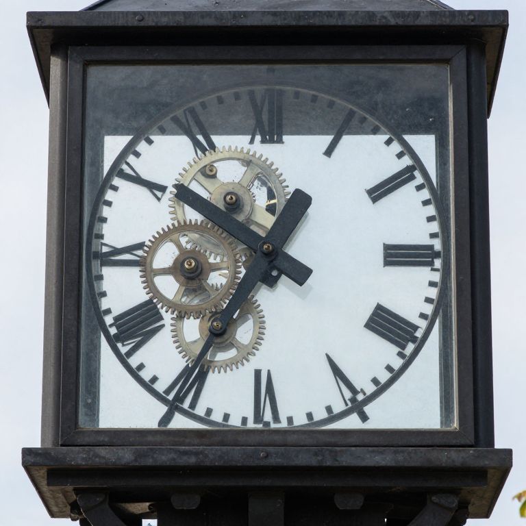 A clocktower with transparent gears holds time trapped like fish in glass, its shadows moving backward during the day.