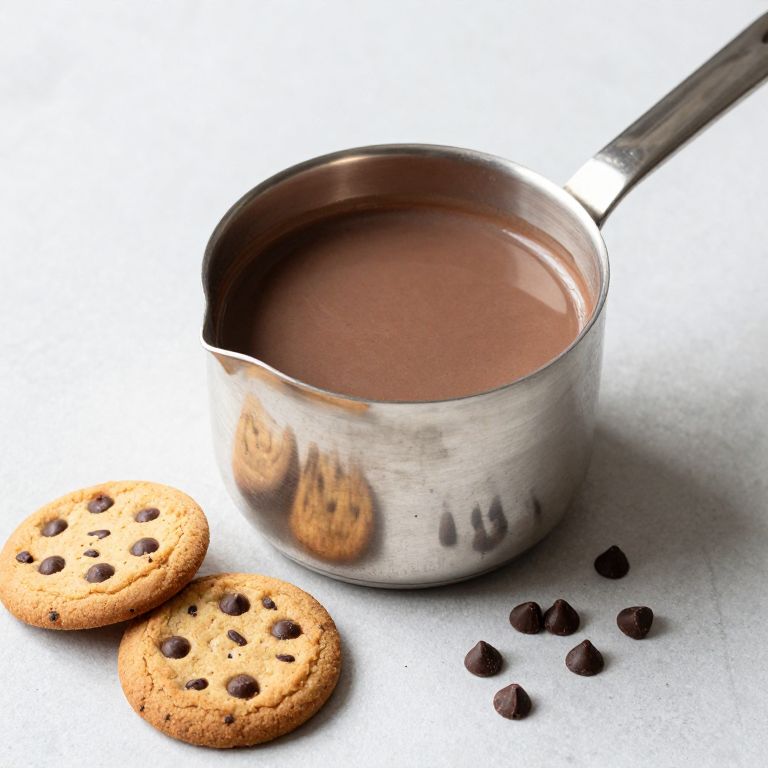 A silver saucepot of hot cocoa next to cookies and chocolate chips.