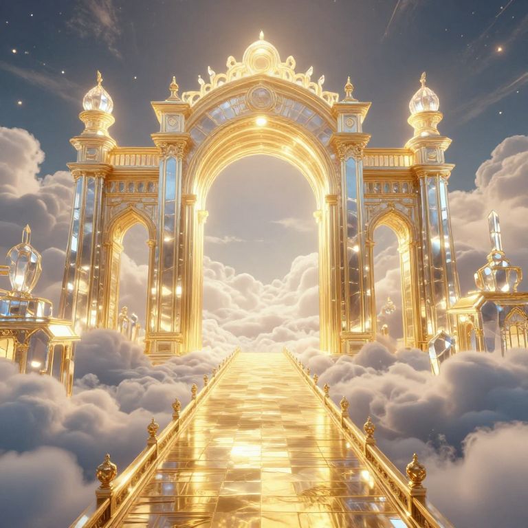 Glorious, golden, archway gate with ornate details, shining brightly, surrounded by fluffy clouds, under a starry night sky, leading