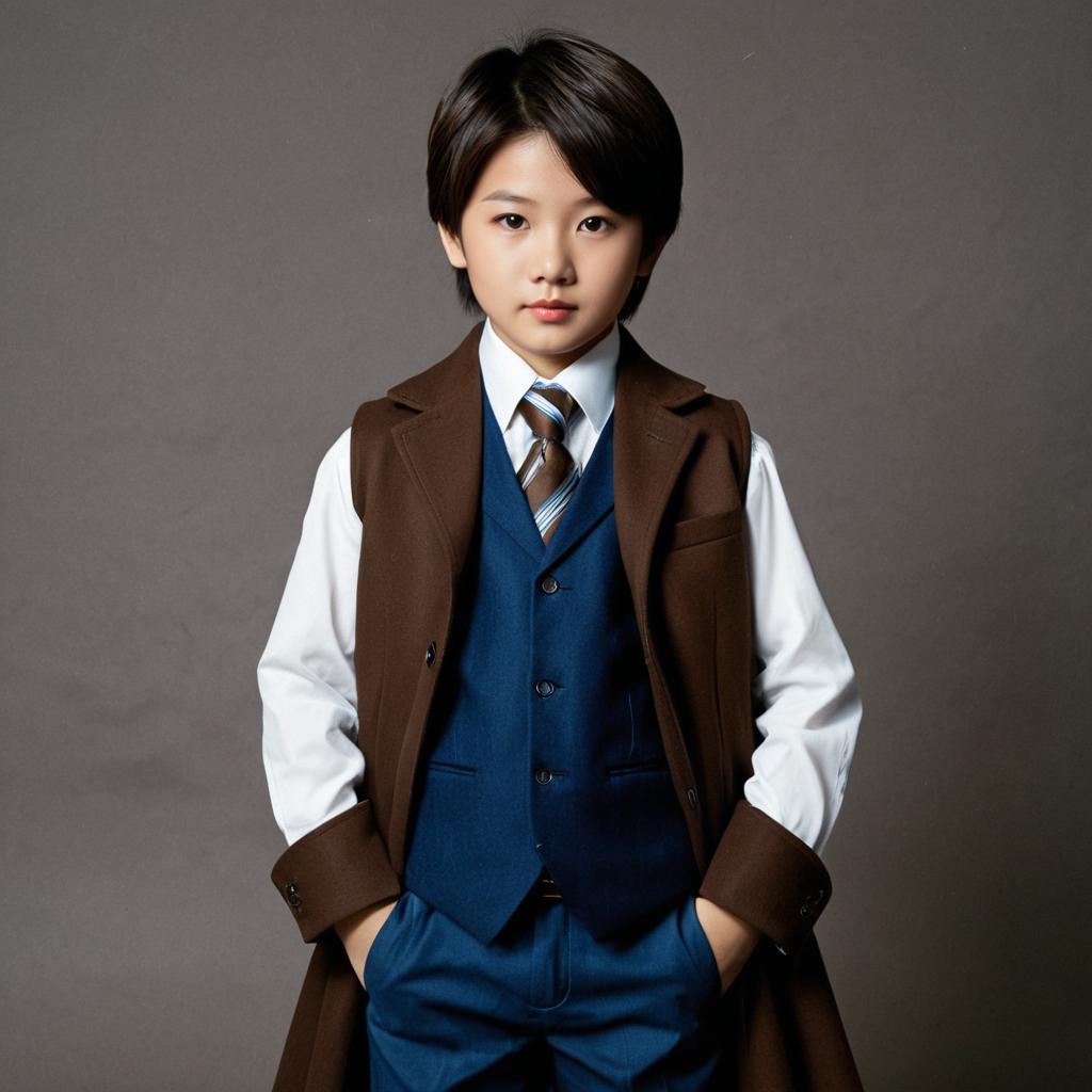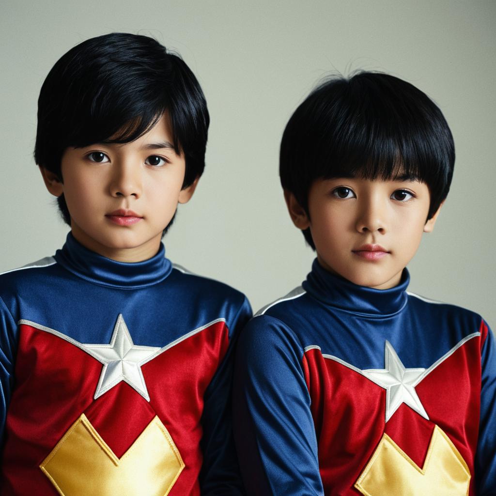 Portrait of two young Asian boys wearing matching Wonder Twins superhero costumes with blue, red, and gold colors featuring a white star emblem. Both boys have black hair, brown eyes, and short hairstyles, posing with a neutral expression against a plain background.