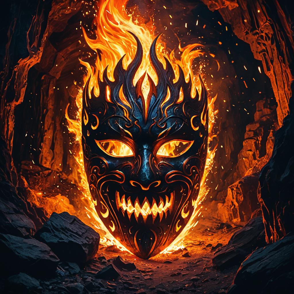 Fire painting of a fiery enchanted mask against an abyssal cave, featuring intense heat effects and swirling sparks in a magical atmosphere.