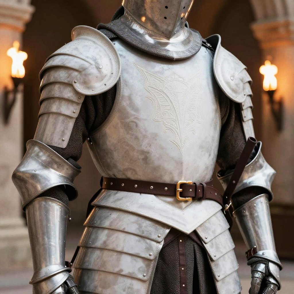 Close-up of white leather armor, embossed patterns, soft light highlighting texture, medieval style, warrior standing in ancient stone hall with torches burning