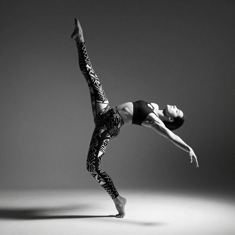 Leggings bending over in a contemporary dance pose inside a minimalist studio, dramatic spotlighting creating strong contrasts, black and white leggings with geometric patterns, expressive body movement captured mid-motion, artistic and dynamic atmosphere