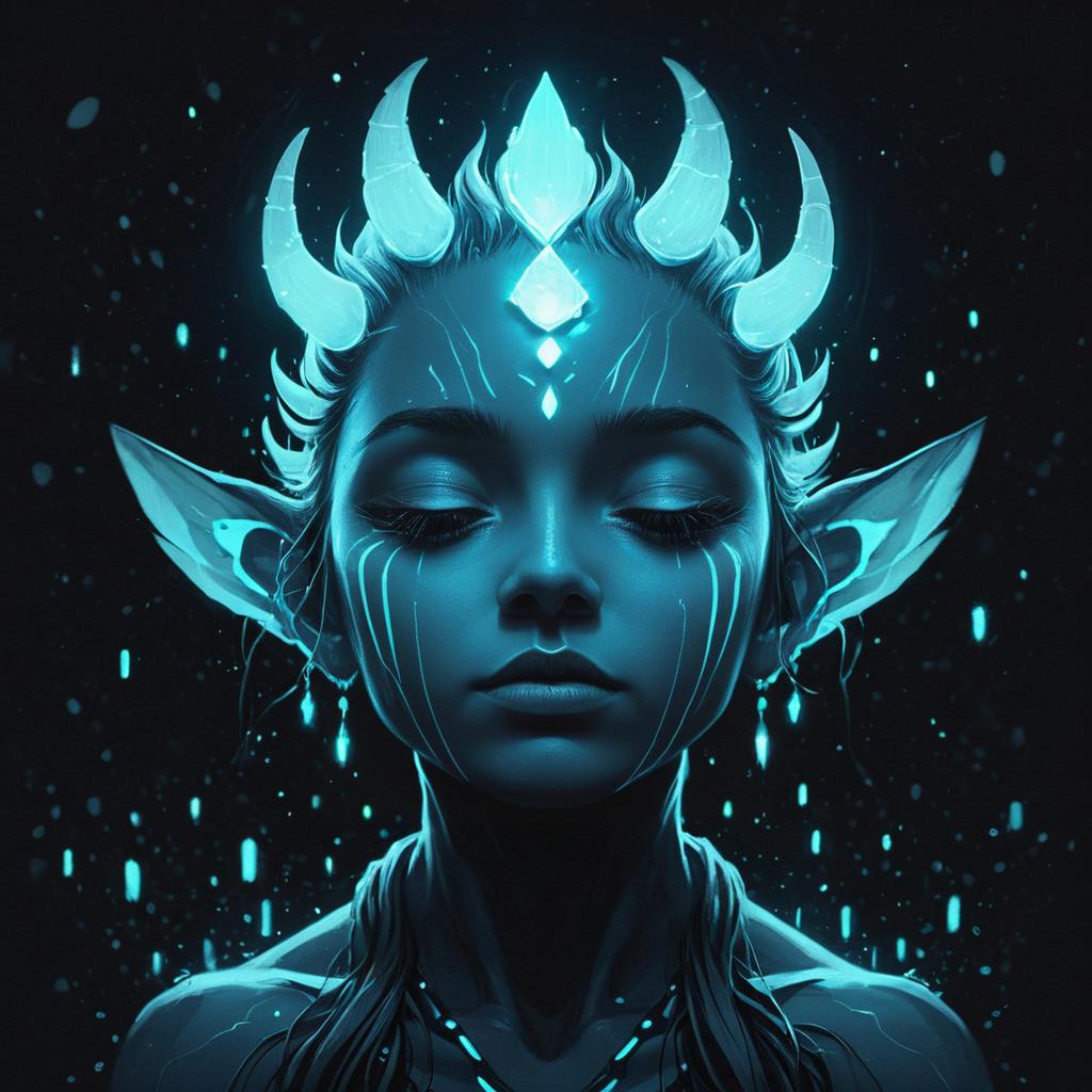 Digital painting of a bioluminescent deity character with glowing horns and pointed ears. The figure has realistic facial features, closed eyes, and intricate glowing markings on the face and neck. The artwork features a soft blue light effect on a dark background, emphasizing the mystical and exhausted mood of the character.