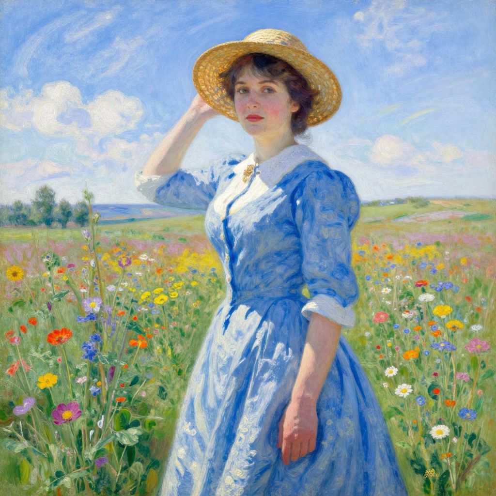 Woman wearing a straw hat and a blue dress stands amidst a vibrant wildflower field under a bright blue sky, embodying the essence of Russian Impressionist painter Yuriy Krотов's 1964 style.