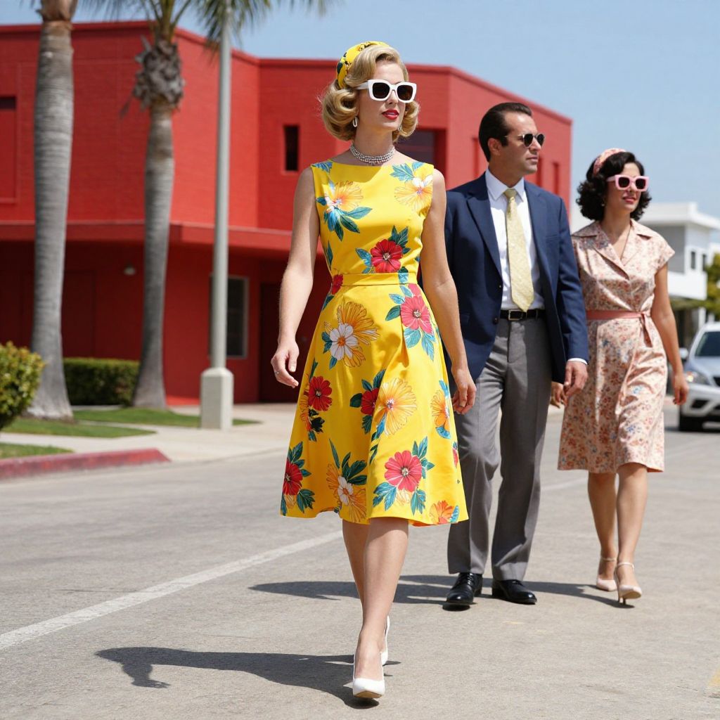 Photograph of a sunny street scene featuring a blonde woman in a bright yellow floral dress with red and orange flowers, white circular sunglasses, and a matching yellow headband. She walks confidently in the foreground, flanked by a man in a dark suit with a white shirt and tie, and a woman in a beige floral dress and sunglasses. The background includes a red brick building, palm trees, and a clear blue sky. The street has white lines and a red curb. The style is reminiscent of 1950s fashion.
