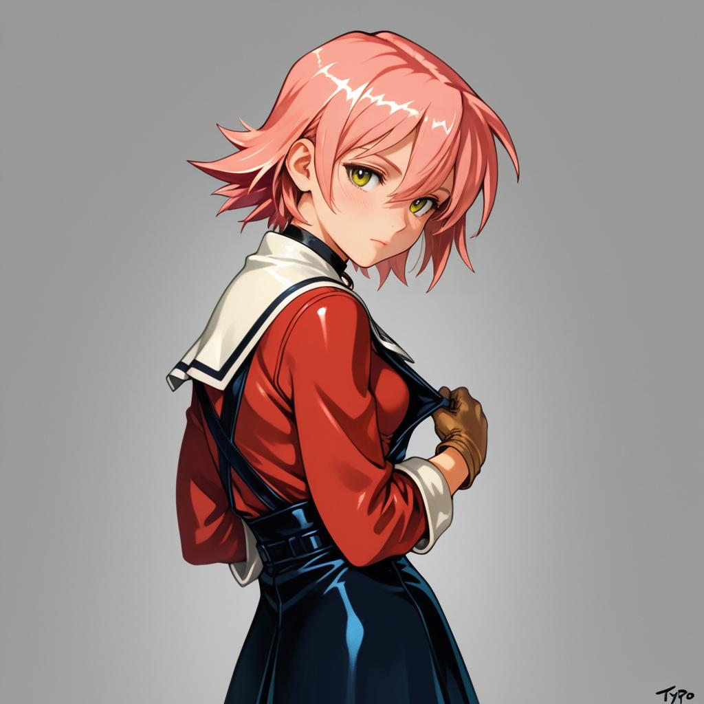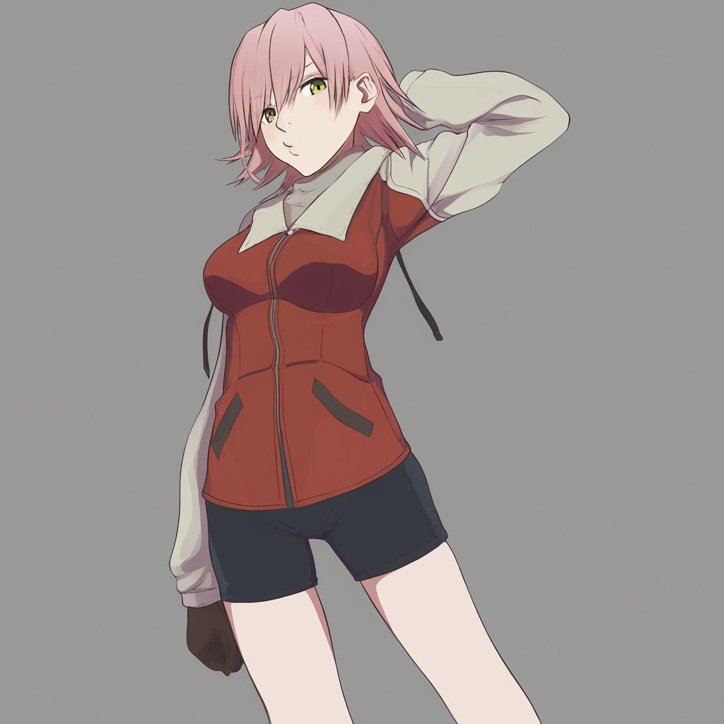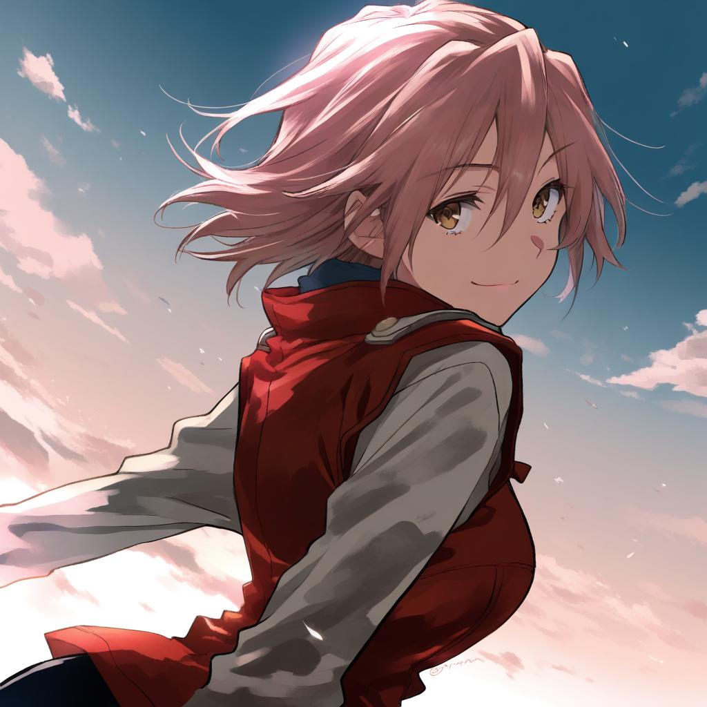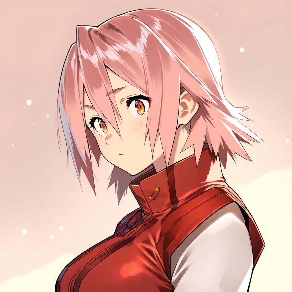 Digital illustration of an anime-style girl with short pink hair and intense yellow eyes, wearing a red high-collared jacket over a white shirt. The girl has a contemplative expression and the background is a soft gradient with light spots.