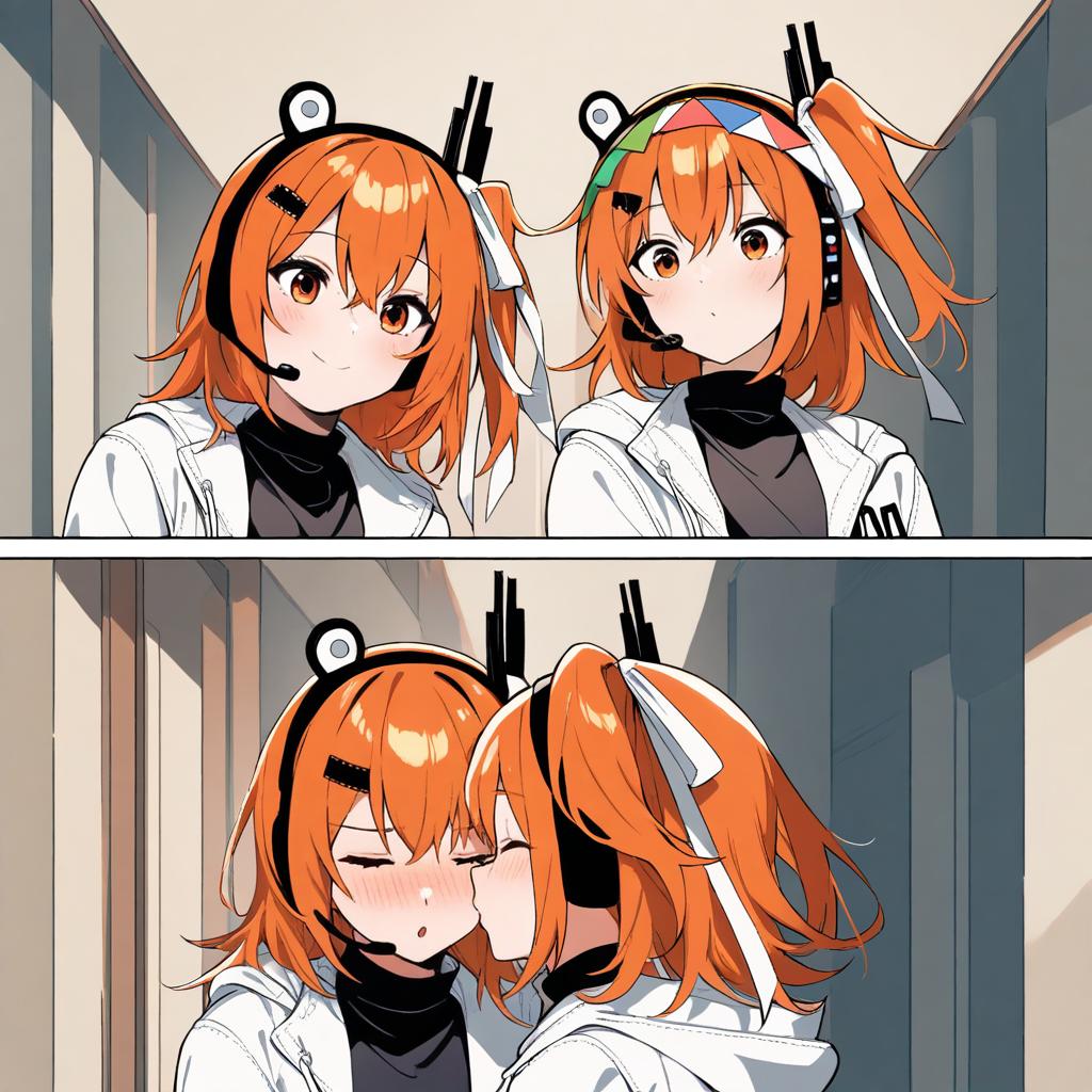 Upper body, adachi rei, orange hair, twin drills, white ribbon, black shirt, red eyes, blush, tongue out, medium hair, headphones, headset, closed eyes, smiles, side ponytail, looking at another, surprise kiss, white jacket, orange eyes, comic style, gentle fondness, lonely corridor, carrying bridal style, pennant headband