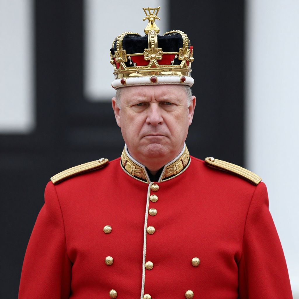 Photograph of a serious-looking middle-aged white man with short gray hair, wearing a bright red military-style uniform adorned with gold epaulettes and buttons. He's also sporting a gold crown with black velvet and a red and black interior, standing against a blurred white and black background. His expression is stern, and the image has a formal, regal vibe.