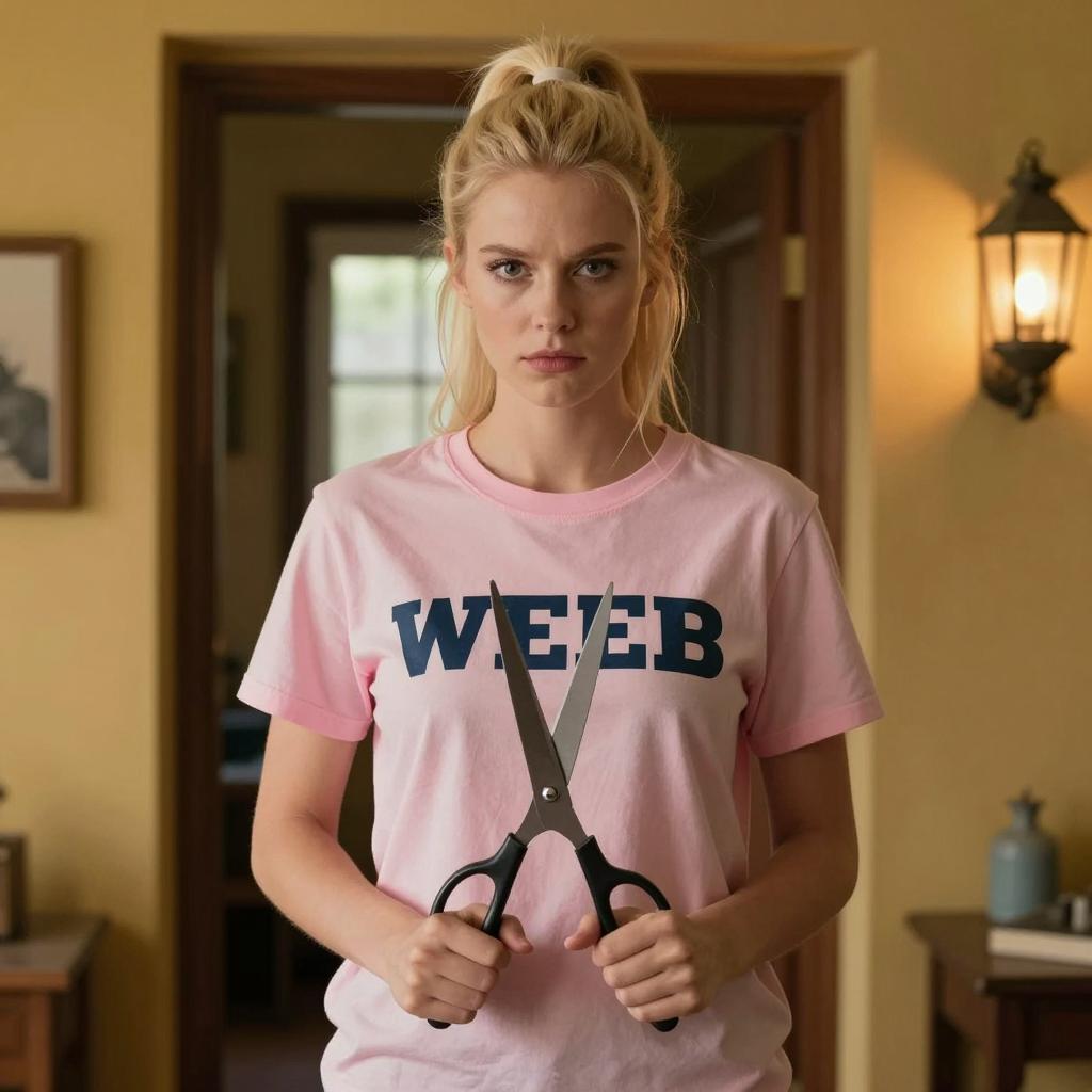 Blonde woman with side ponytails, wearing a pink "WEEB" t-shirt, holds large scissors in front of her. She stands in a dimly lit doorway with a yellow wall and a lit lantern on the right. Her expression is serious. Background includes a window and framed picture. She is the only person.