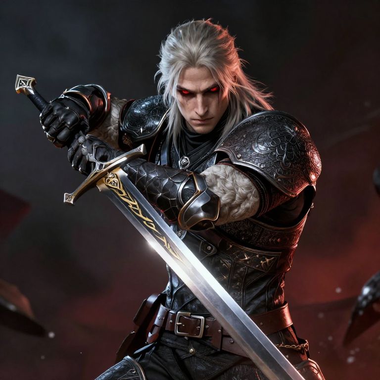A cyberpunk Geralt of Rivia in combat, wielding a sword and wearing ornate armor with glowing red eyes.