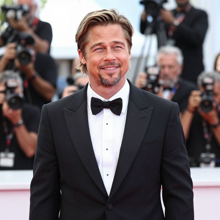 Brad Pitt smiles confidently at the \"Once Upon a Time in Hollywood\" photocall during the 72nd Cannes Film Festival on May 22, 2019, dressed in a sleek black tuxedo with a crisp white shirt and bow tie.