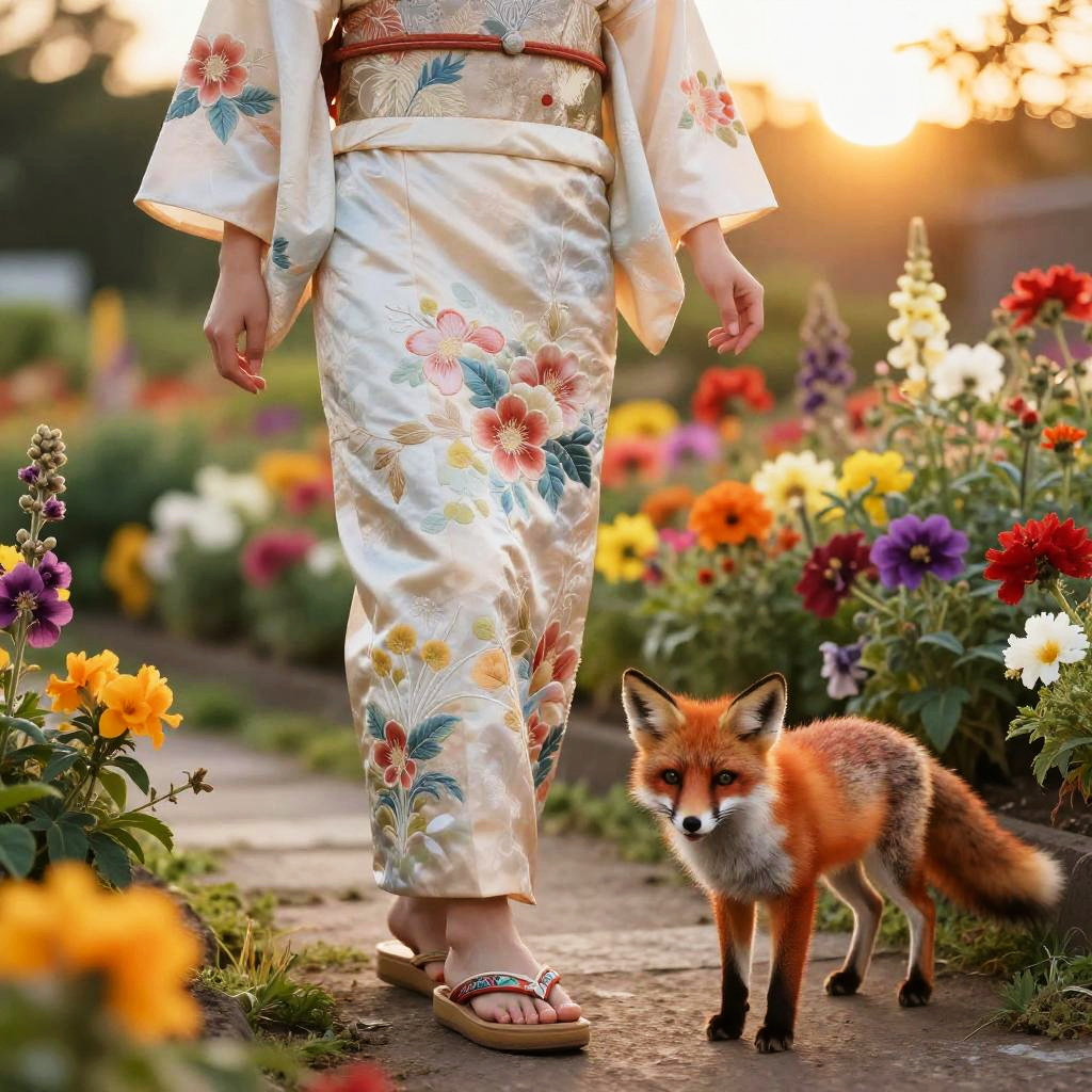 A woman in a silk kimono with floral embroidery wearing embroidered zori sandals explores a vibrant garden filled with colorful flowers at sunset. A playful small red fox with a bushy tail accompanies her, adding charm to the scene.