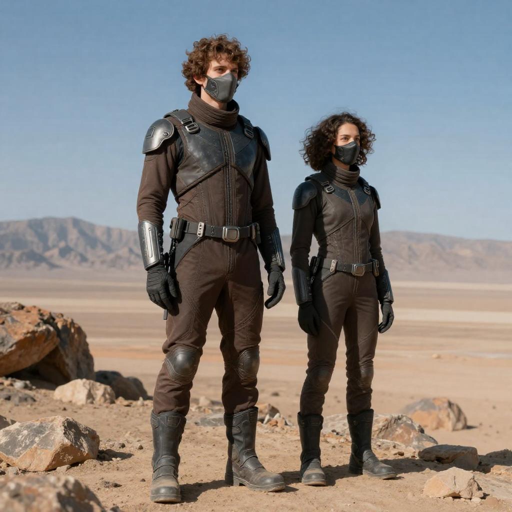 Photograph of two people in futuristic, dark brown, armored suits standing on a rocky, desert-like landscape with a vast, flat plain and distant mountains under a clear, blue sky. Both have curly hair, wear masks, and look forward. The person on the left is taller, while the person on the right is slightly shorter.