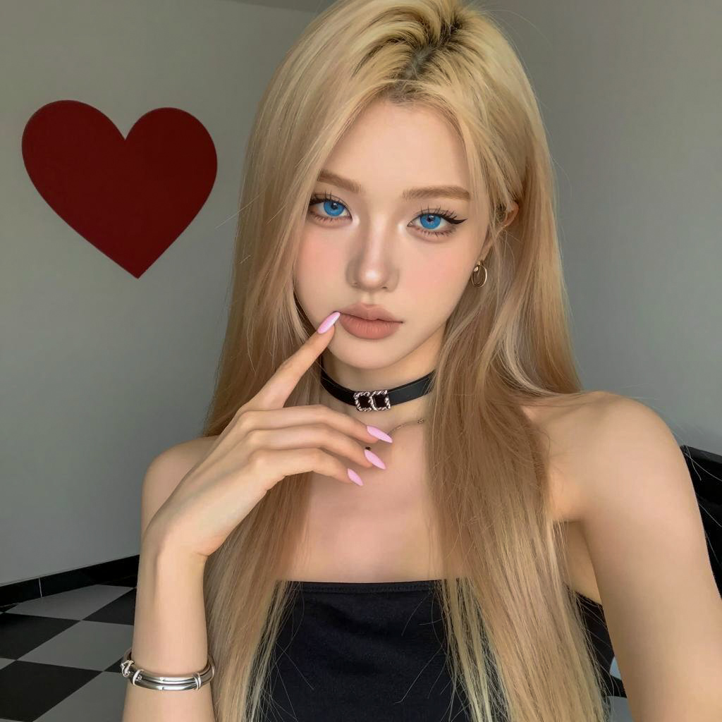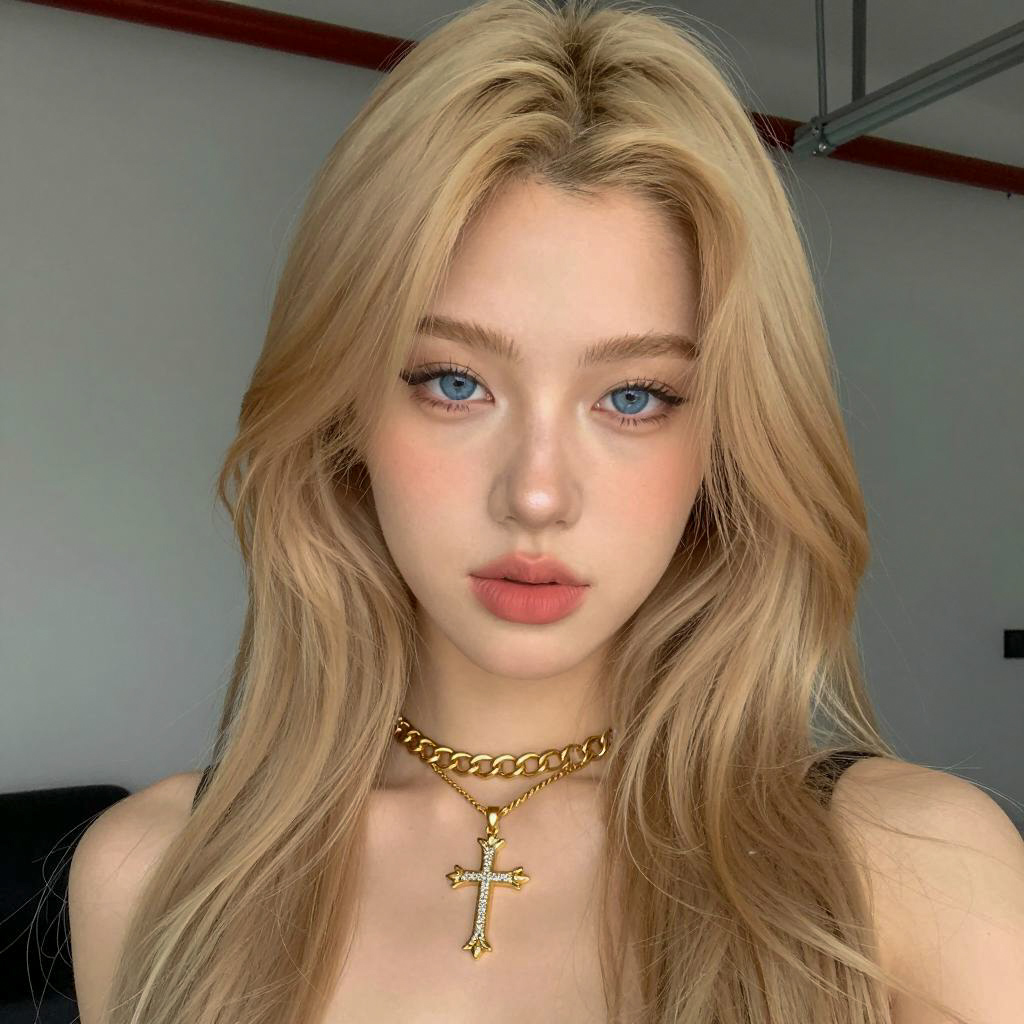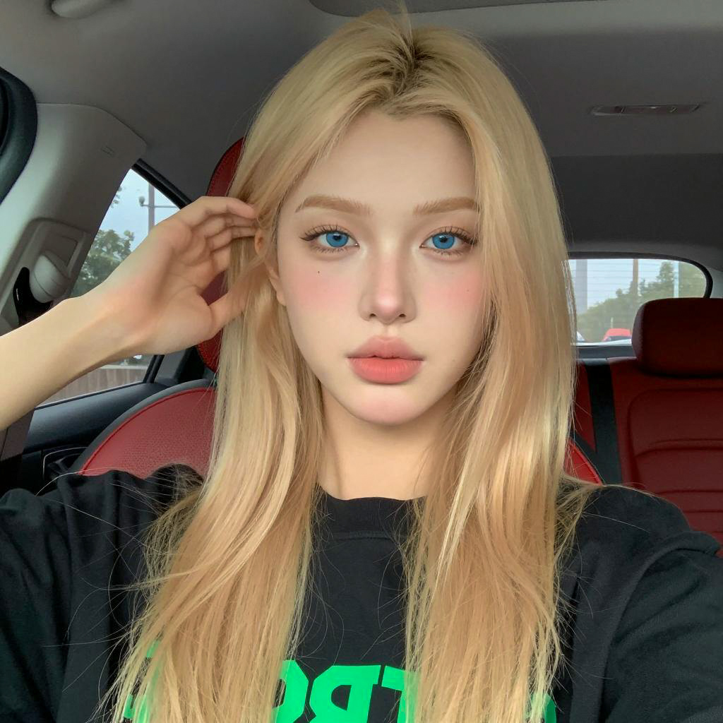 Portrait of a young woman with long, straight blonde hair, striking blue eyes, and full pink lips. She is wearing a black shirt with a green graphic design, seated inside a car with red and black leather seats. The woman is touching her hair with her right hand and has a neutral facial expression. The car interior is visible, including the window showing a faint outdoor background.