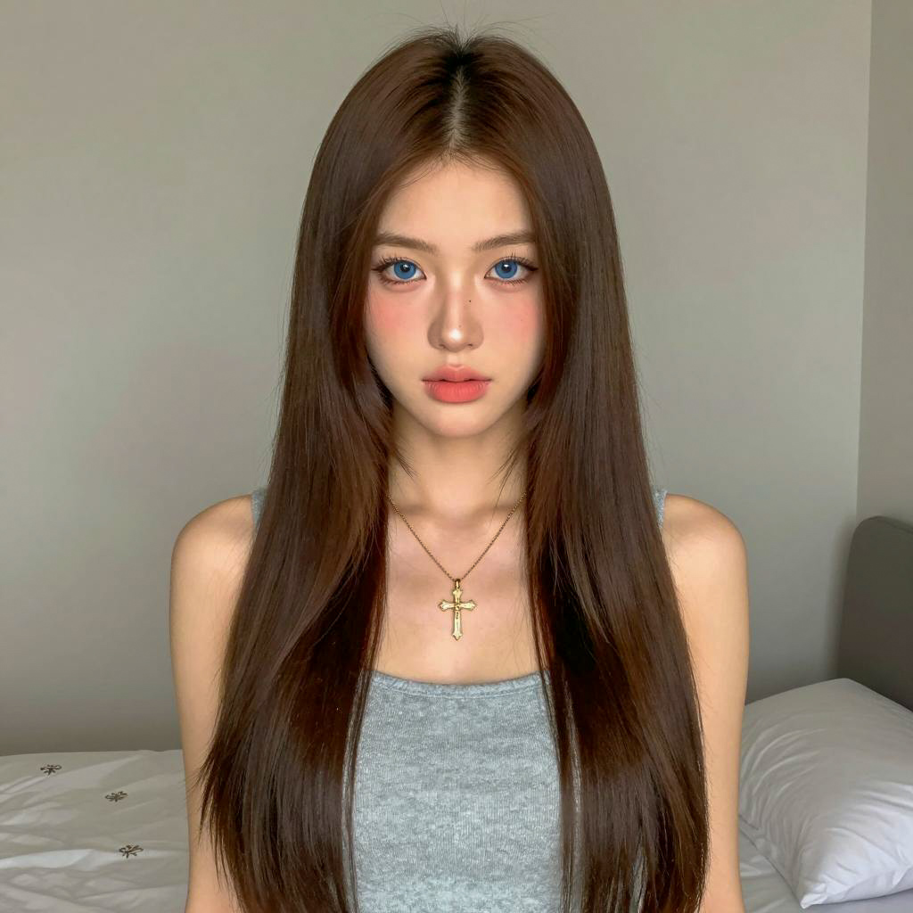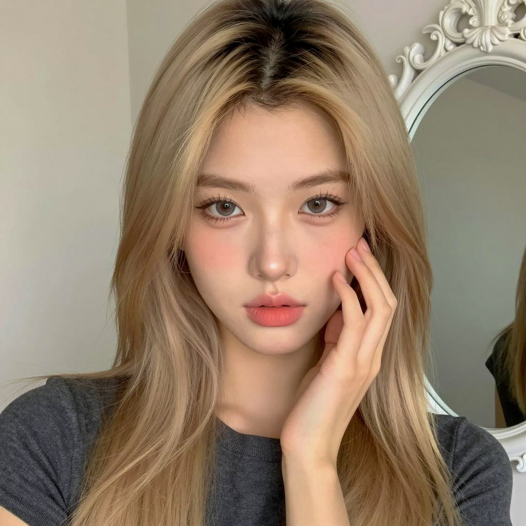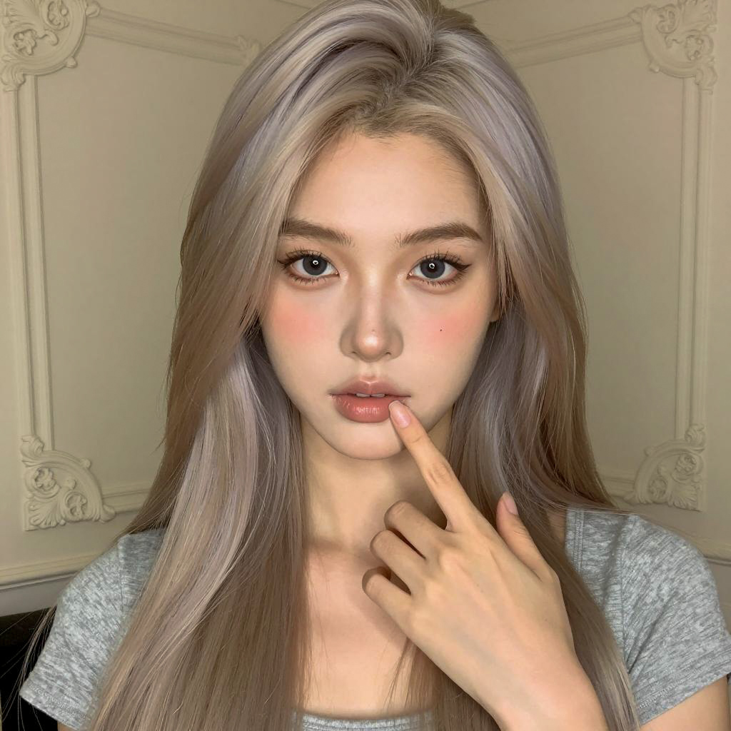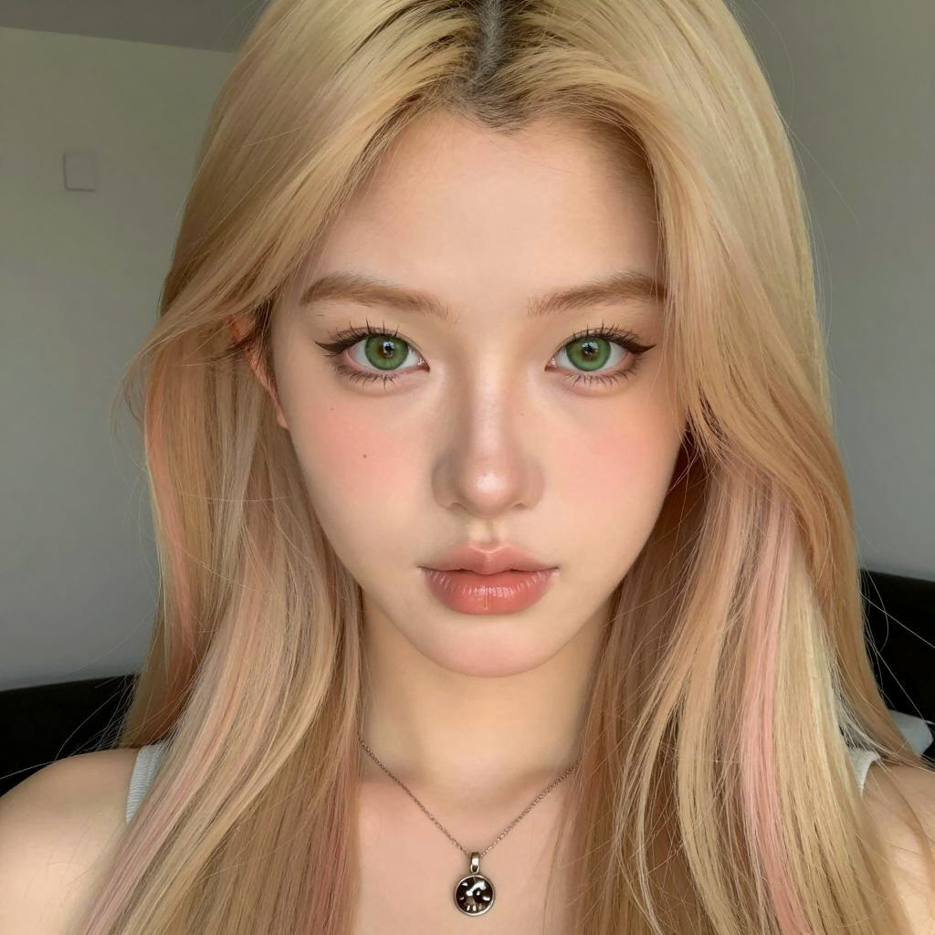 Portrait of a young woman with long, straight blonde hair, striking blue eyes, and full pink lips. She is wearing a black shirt with a green graphic design, seated inside a car with red and black leather seats. The woman is touching her hair with her right hand and has a neutral facial expression. The car interior is visible, including the window showing a faint outdoor background.