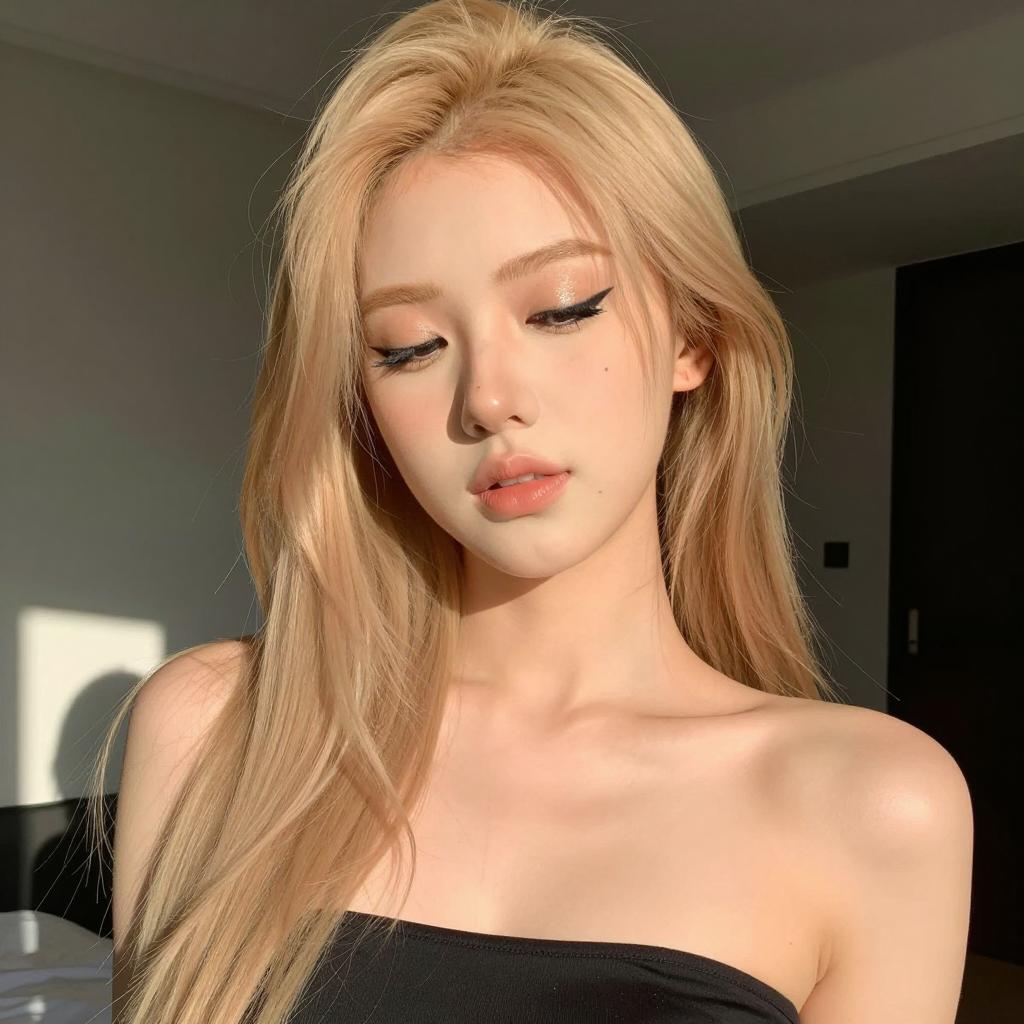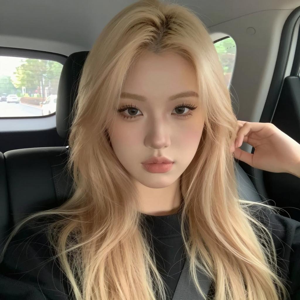 Photograph of a young woman with long, straight blonde hair, blue eyes, and full pink lips. She is wearing a black shirt with a green graphic, touching her hair with her right hand. She is seated in a car with a red and black seat. Background includes the car's interior and a dark ceiling. She has a neutral expression.